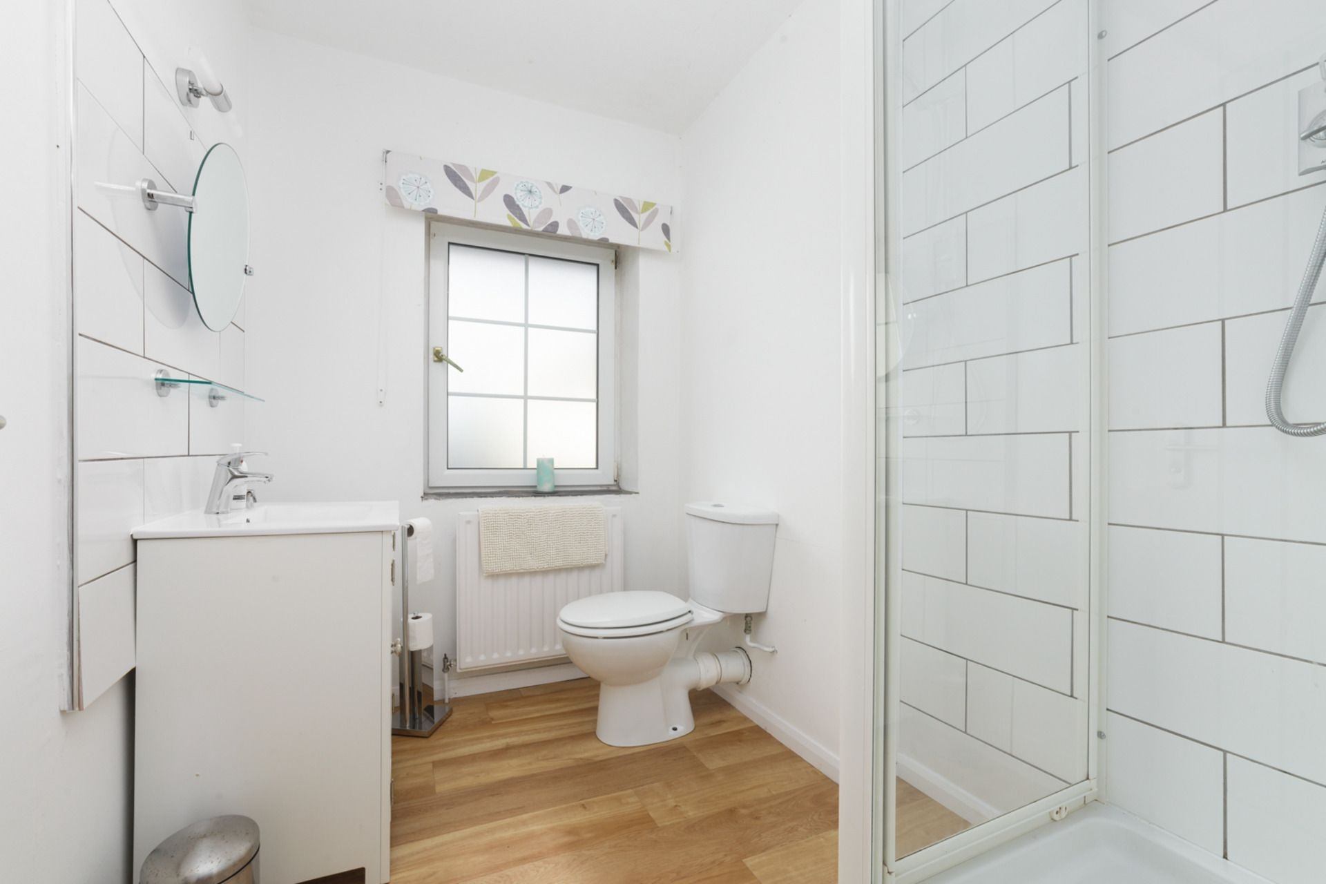 Bathroom: Walk in shower, washbasin and wc.