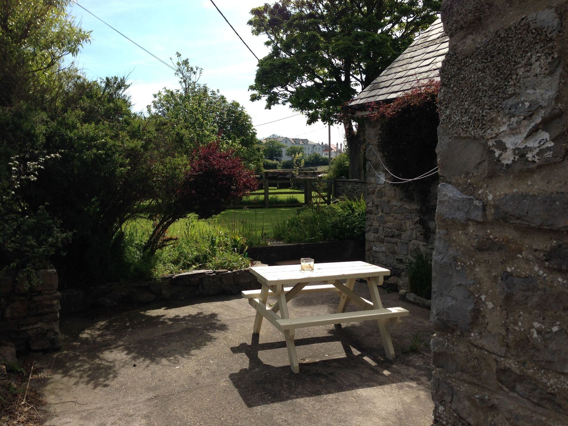 Outside area: Sheltered patio seating area with bench and table and disposable BBQ area. Sunny well-maintained garden with lawn.