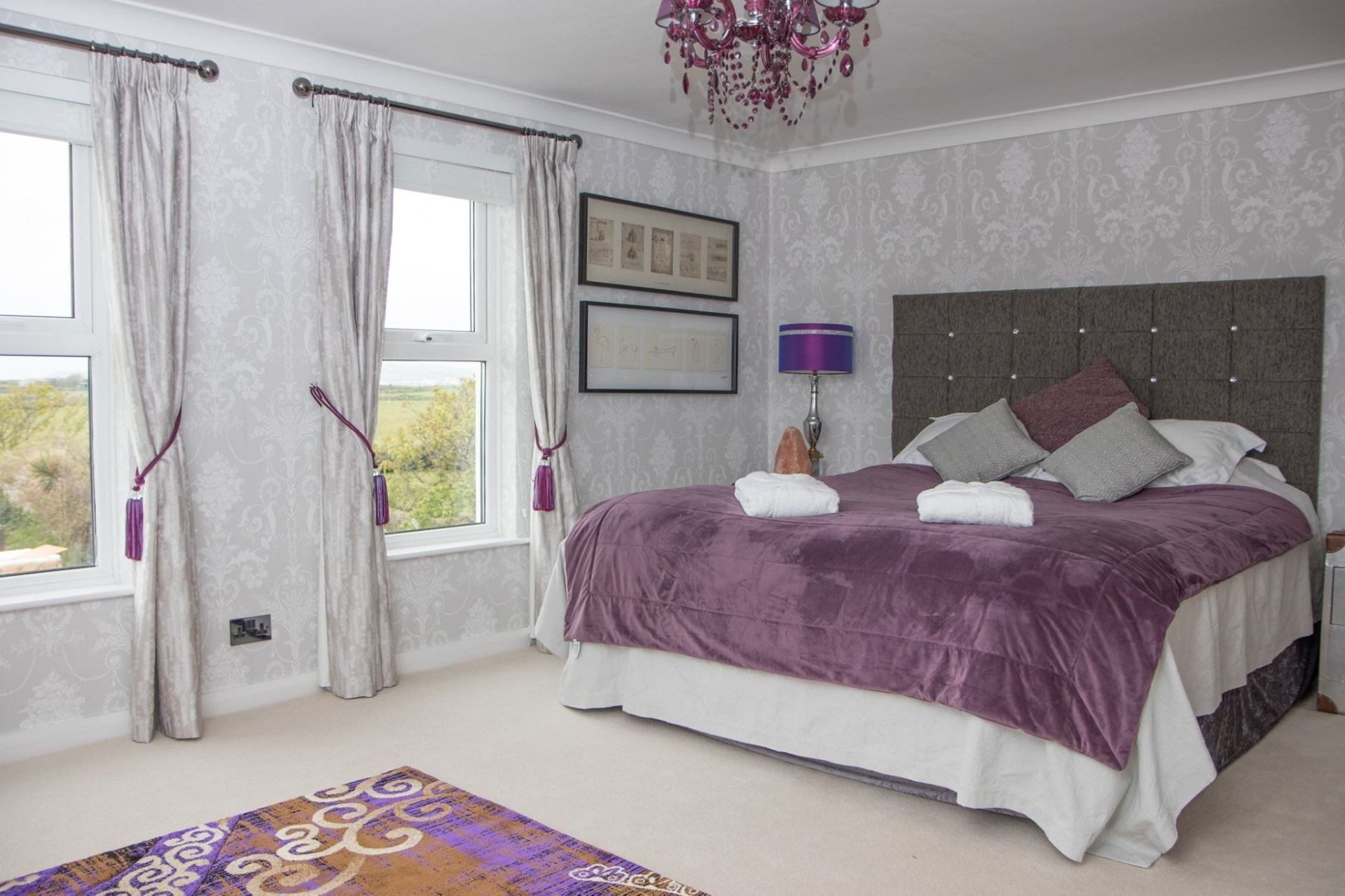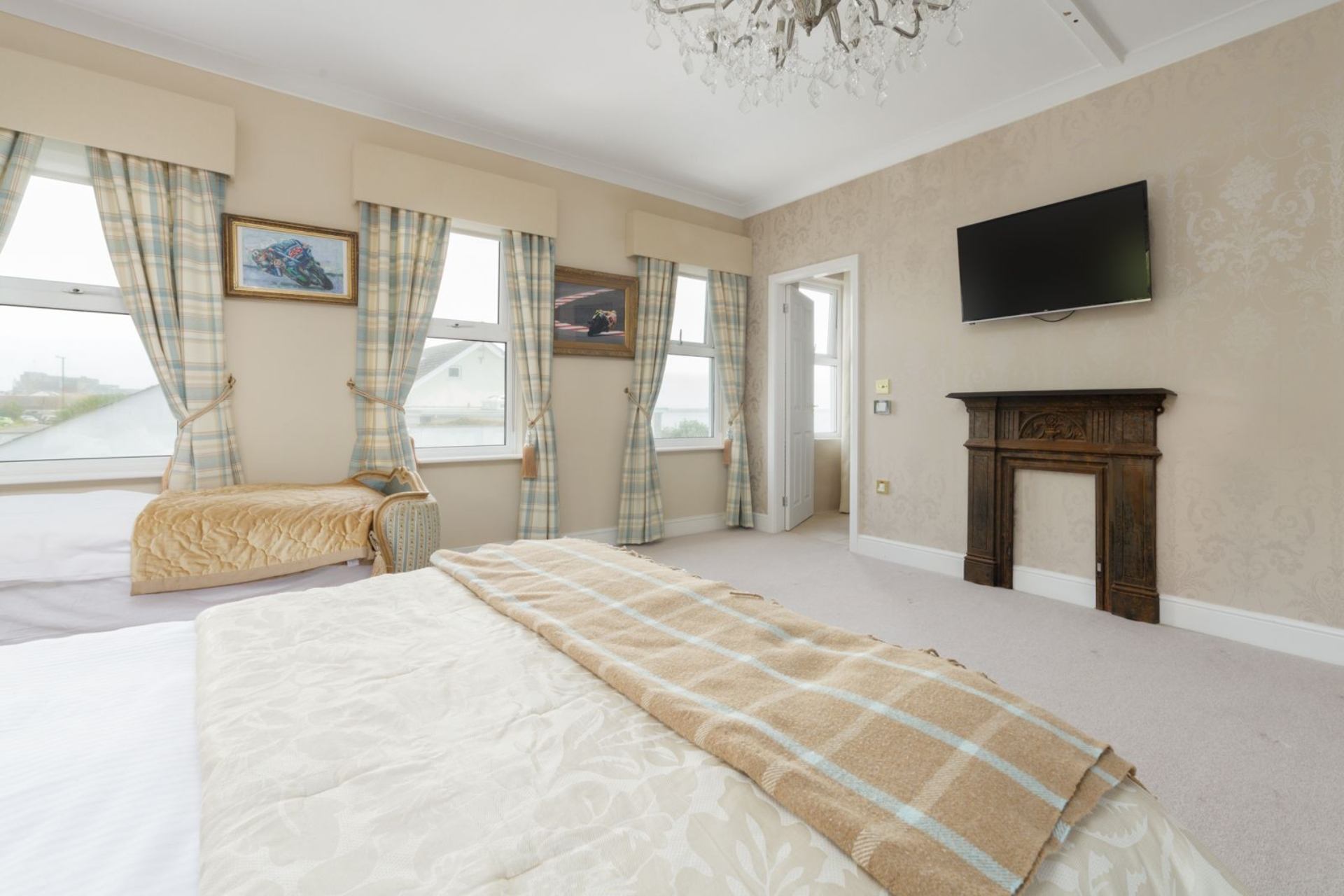 Bedroom 2 (Castletown View): Double bed, bedside tables, wardrobe, TV, ensuite bathroom.
