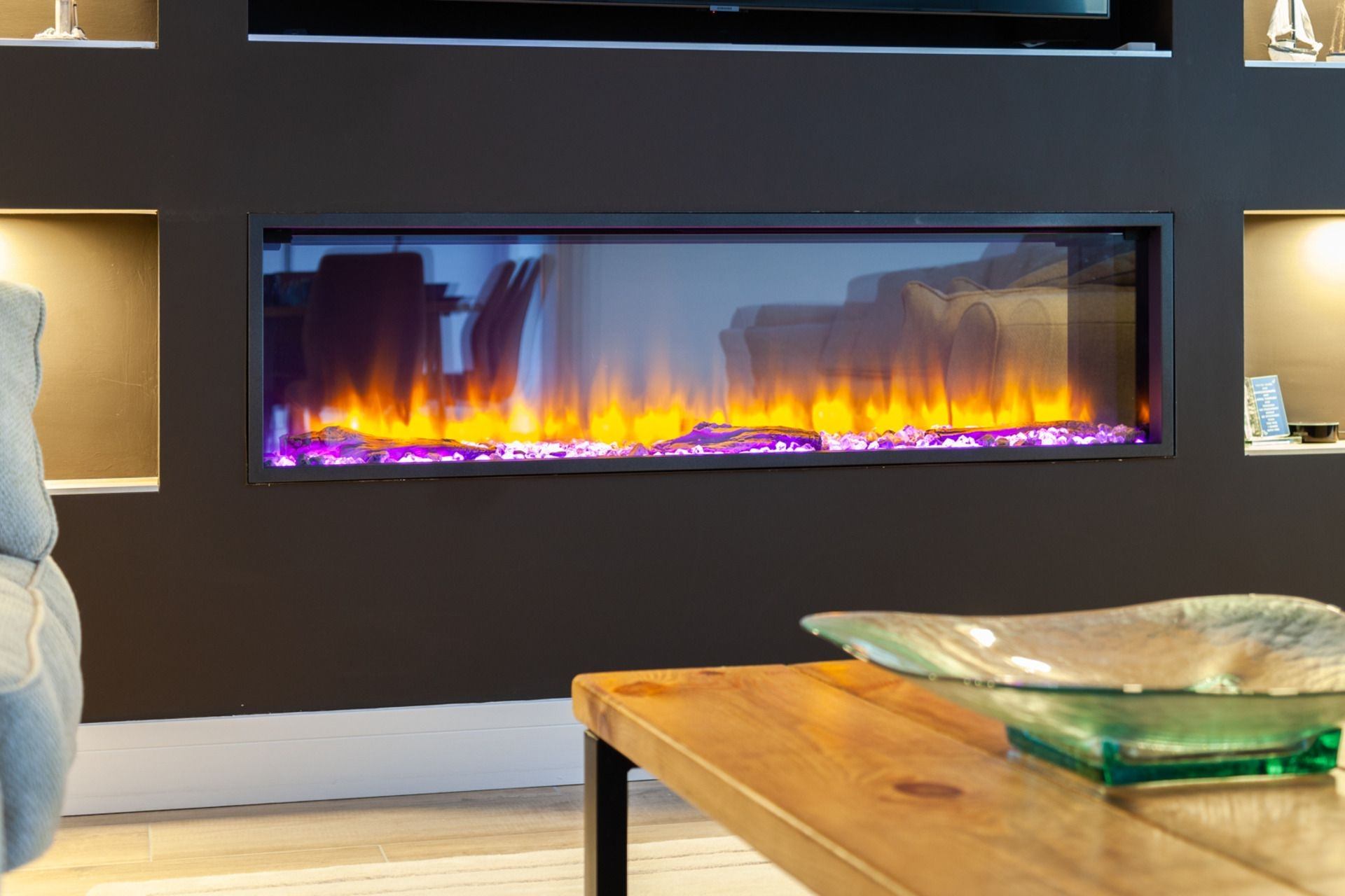 Lounge: Electric fire, three sofas, coffee table, Smart TV and a spectacular view.