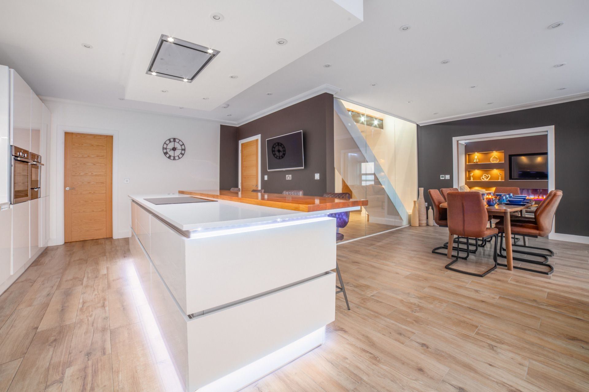 Kitchen/Dining area: Oven, combi microwave, boiling water tap, large integrated fridge / freezer, dishwasher, Smart TV, dining table & eight chairs and kitchen island featuring electric hob, breakfast bar and pop-up socket.