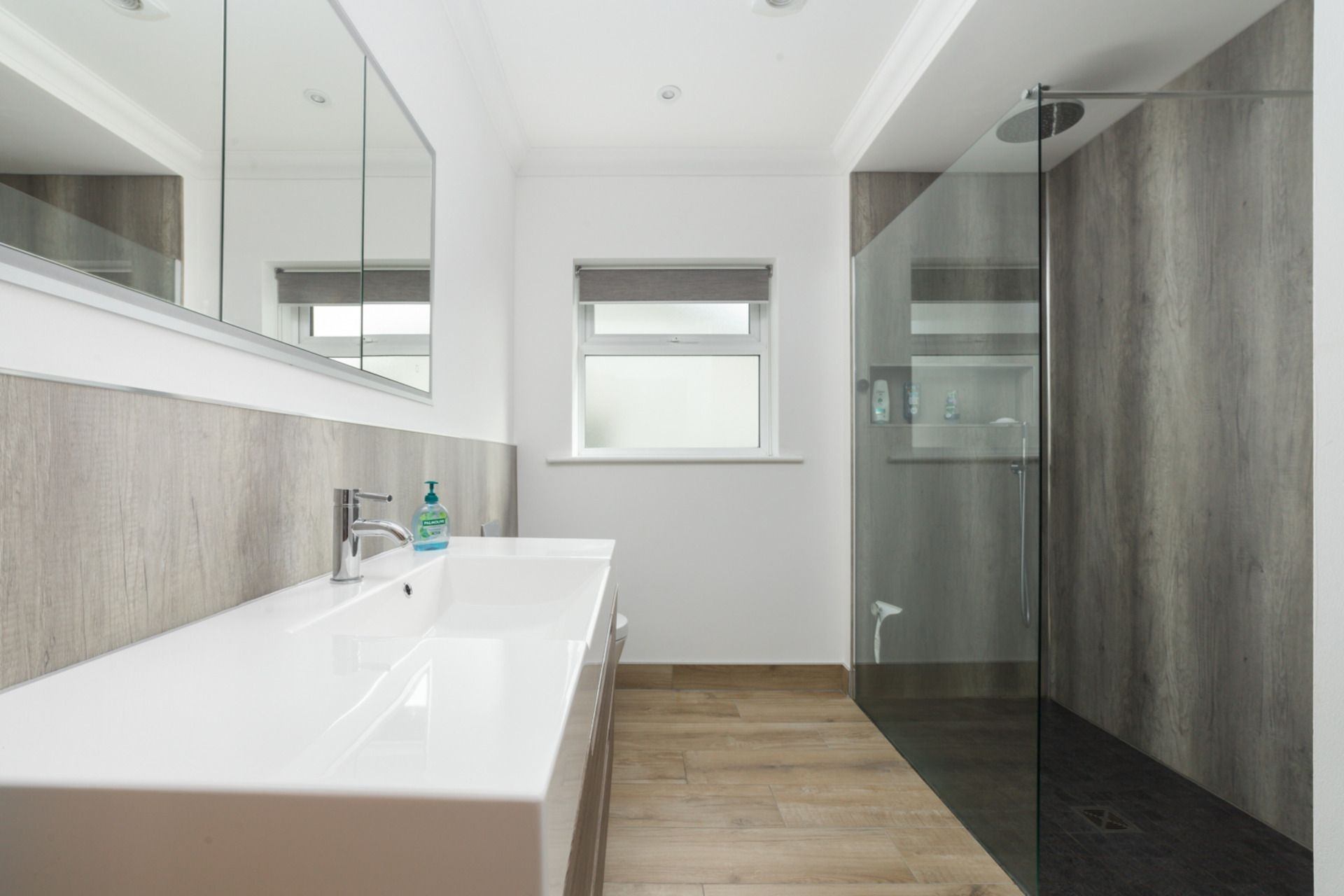 Bathroom: Walk-in shower, WC and wash hand basin with drawers.