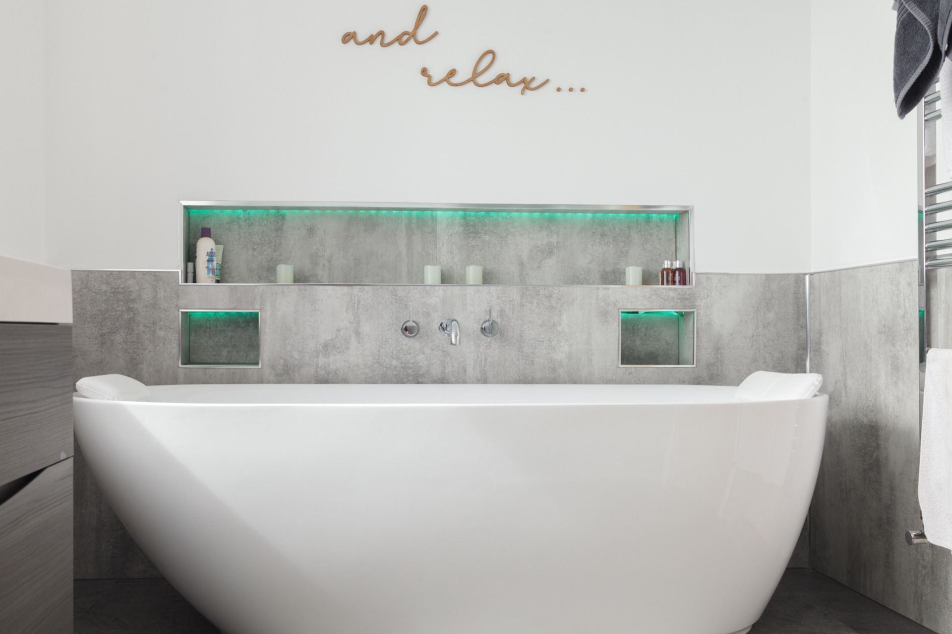 Bathroom: Relax in the free standing bath with head rests, walk-in shower, WC and wash hand basin with drawers.