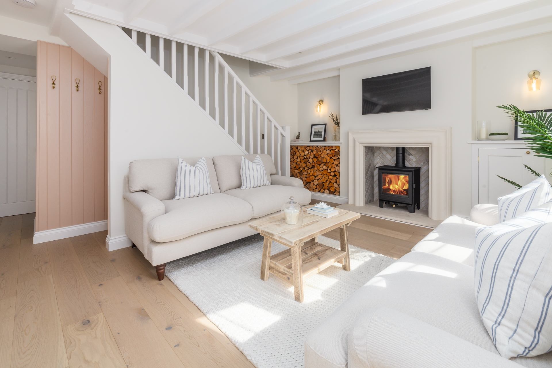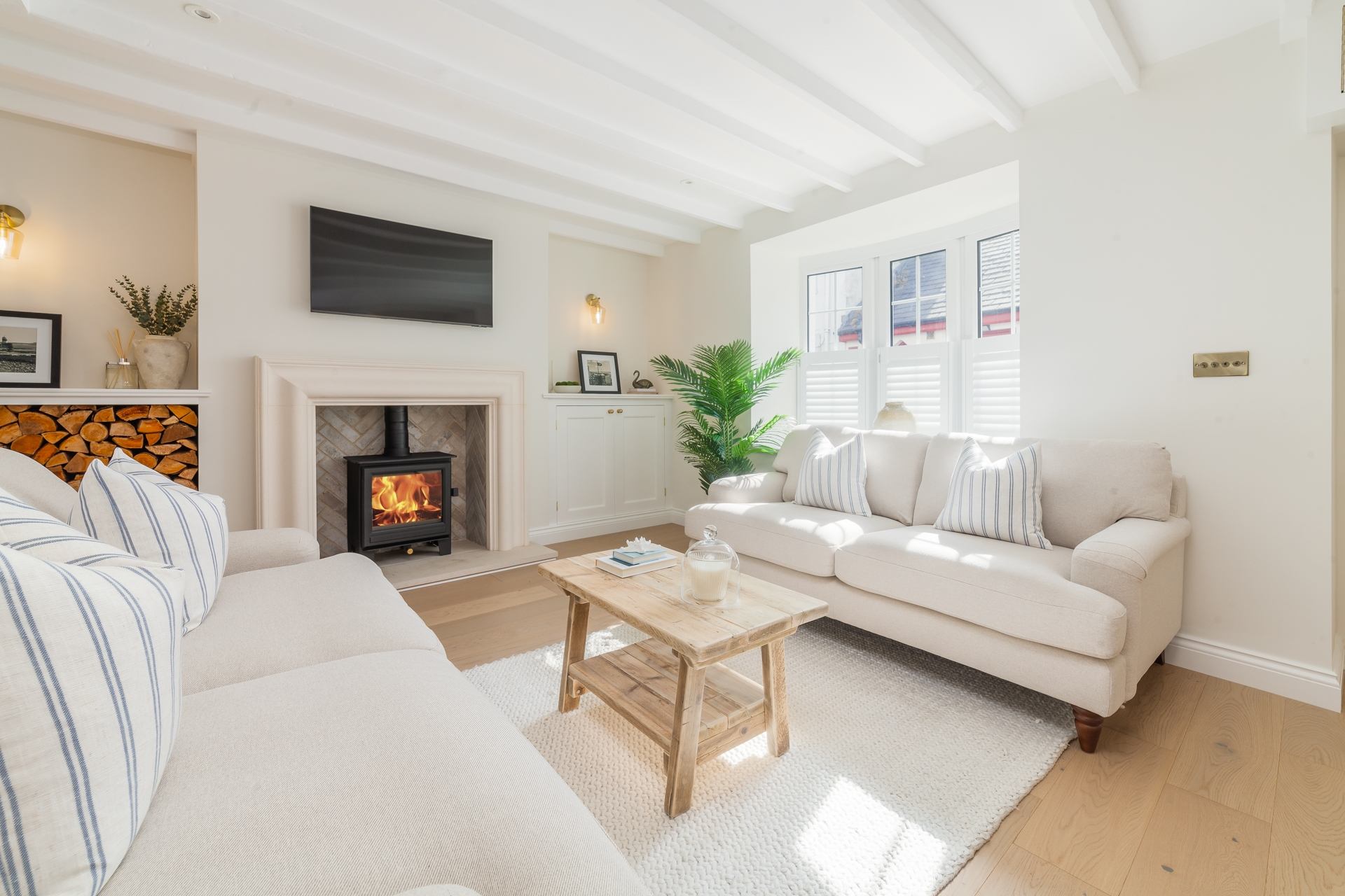 Living Area: Two stylish and comfortable sofas, Smart TV, coffee table and log burner