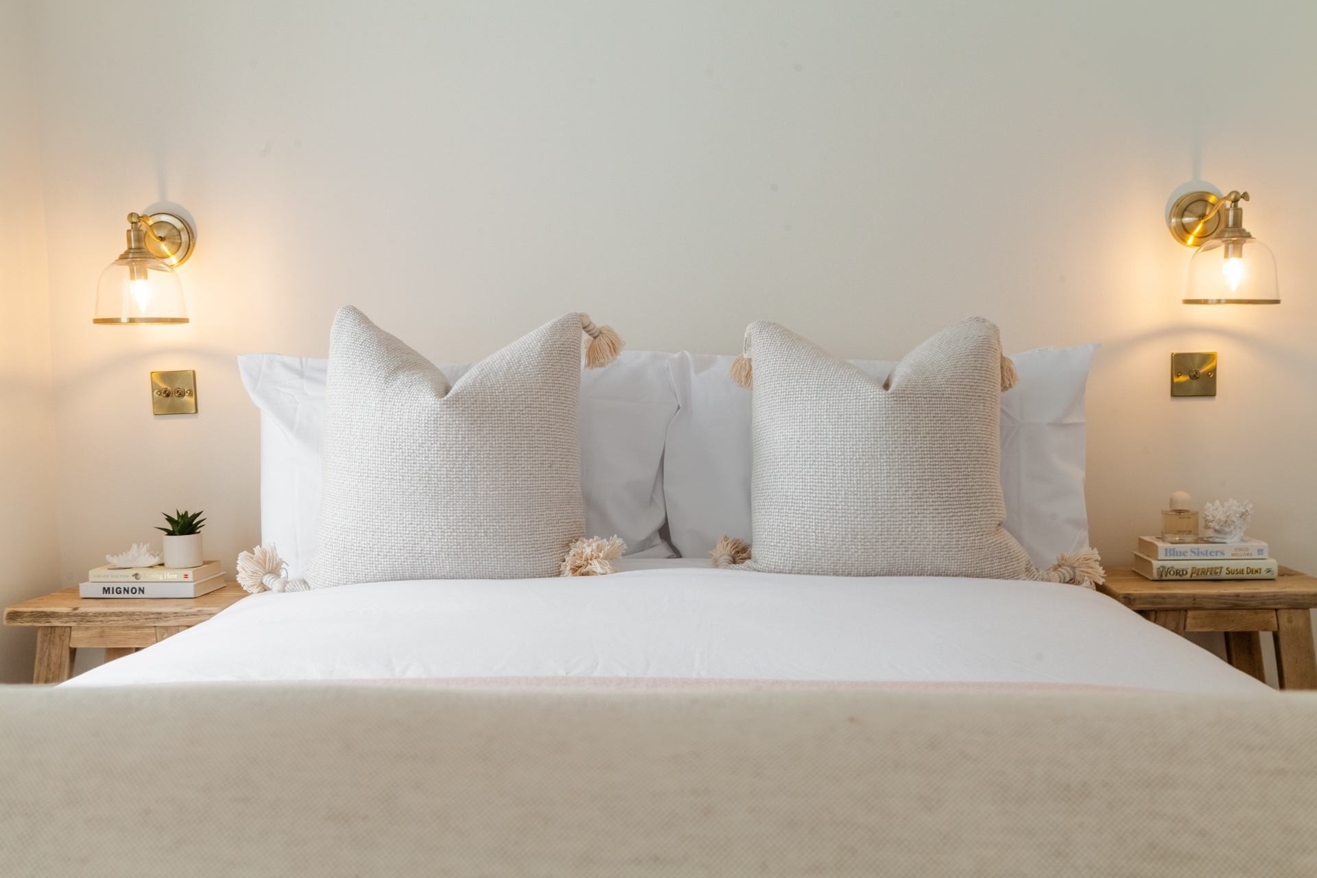 Inside, the interiors are calm, refined and effortlessly inviting. The living space centres around a characterful log burner, creating a cosy yet sophisticated setting for relaxed evenings after a day exploring the south of the island. Every finish has been carefully considered, resulting in a space that feels both high-end and welcoming.