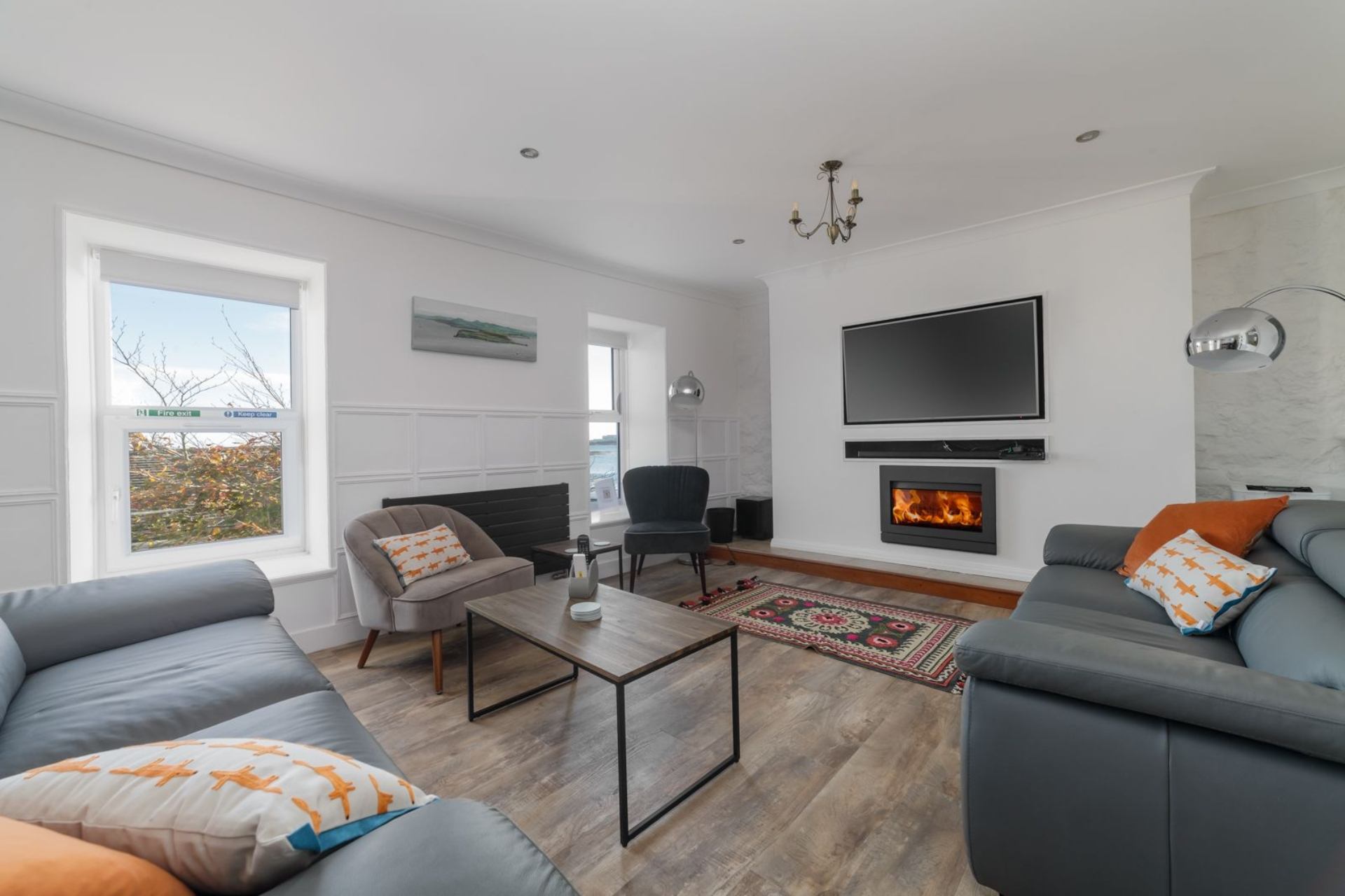Lounge: Two sofas and two cosy chairs, comfortable seating, Smart TV, DVD player, coffee table.