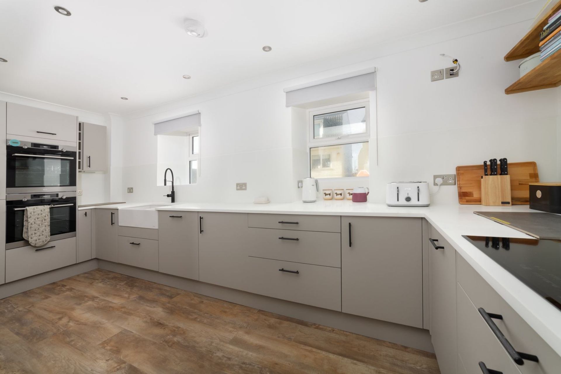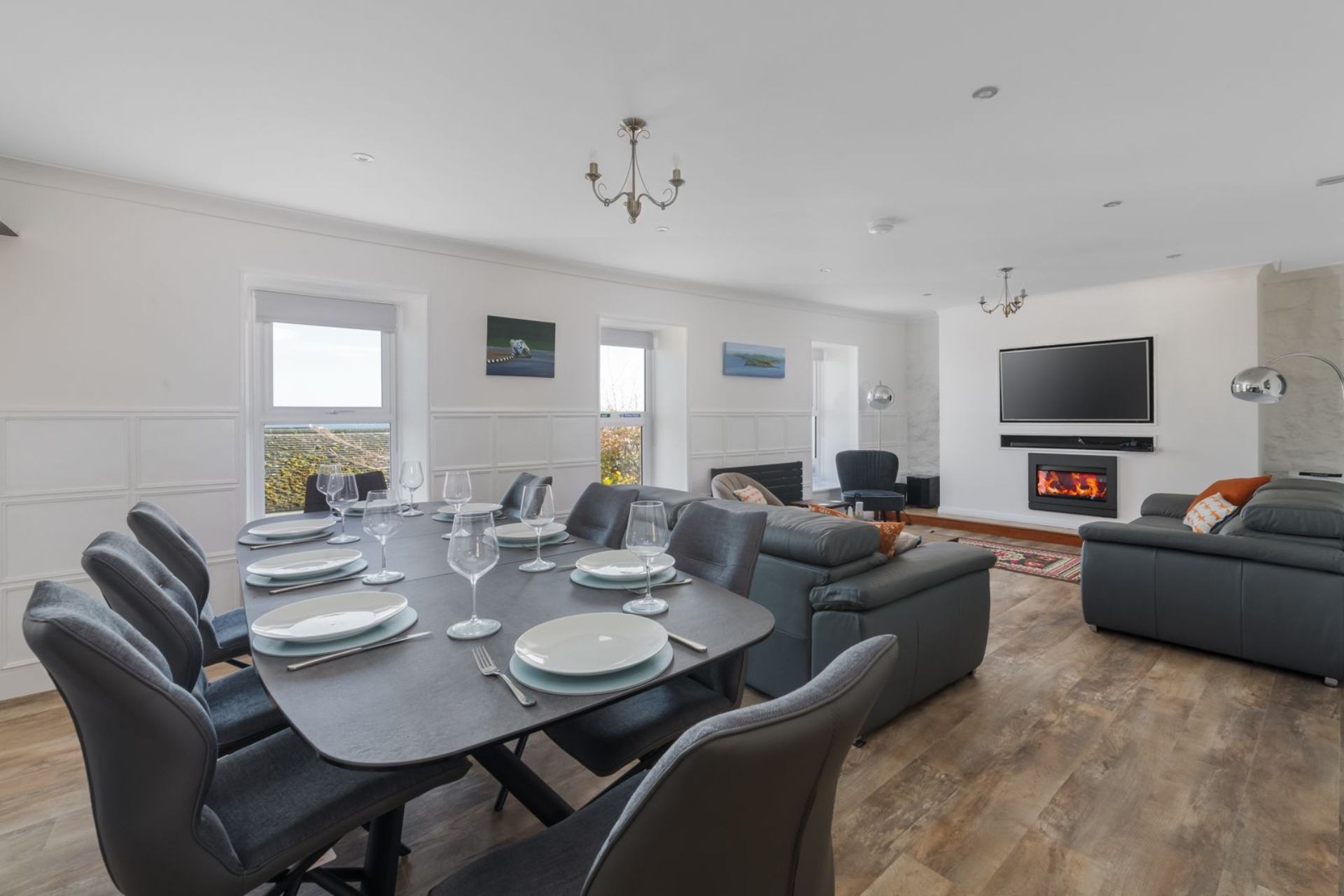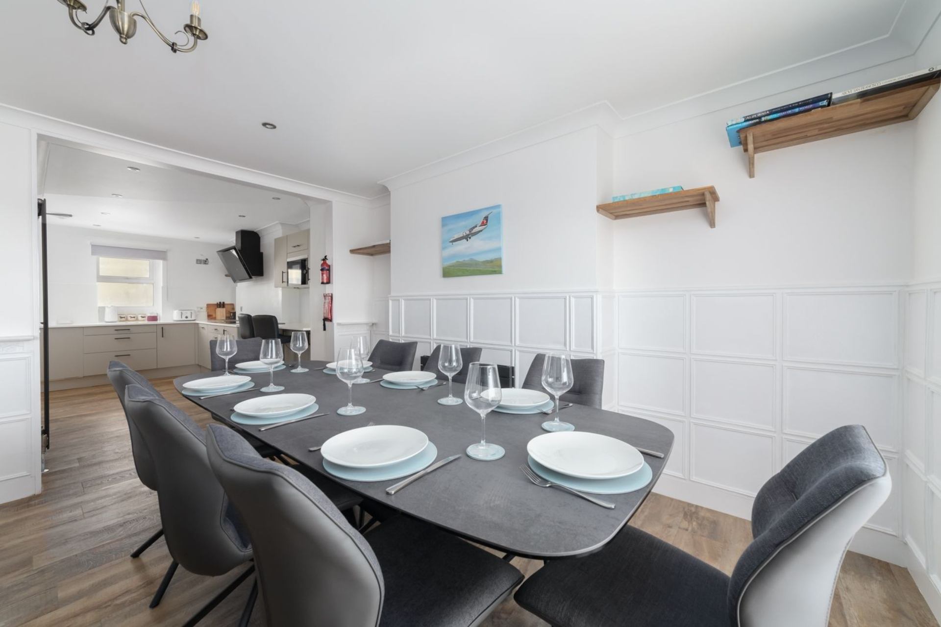 Kitchen/Dining area: Two ovens, AEG induction hob, large fridge, freezer, microwave, dishwasher, breakfast bar with two stools, Smart TV and dining table with eight chairs