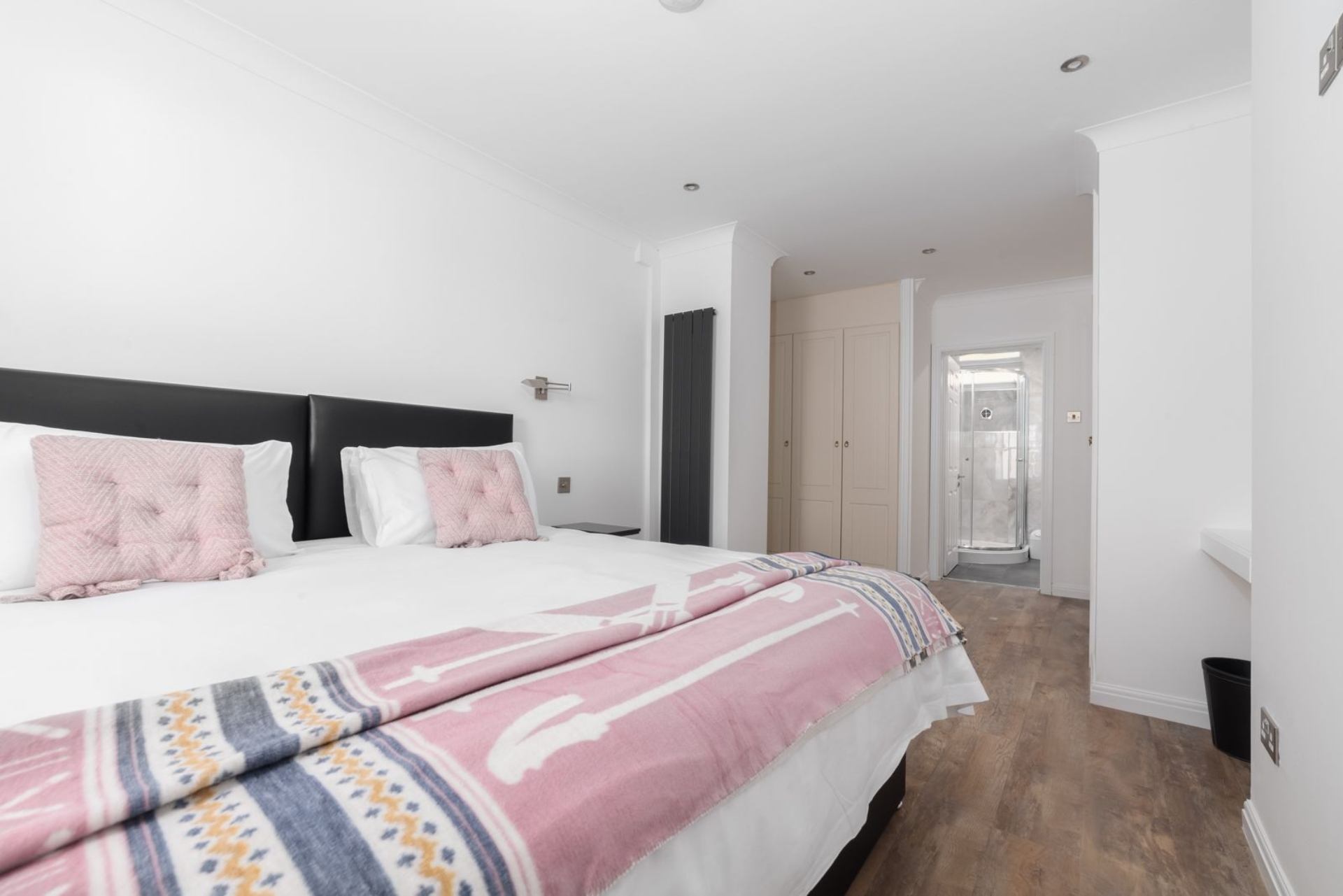En-suite: Shower with rainfall shower head, WC, wash hand basin with storage and heated towel rail