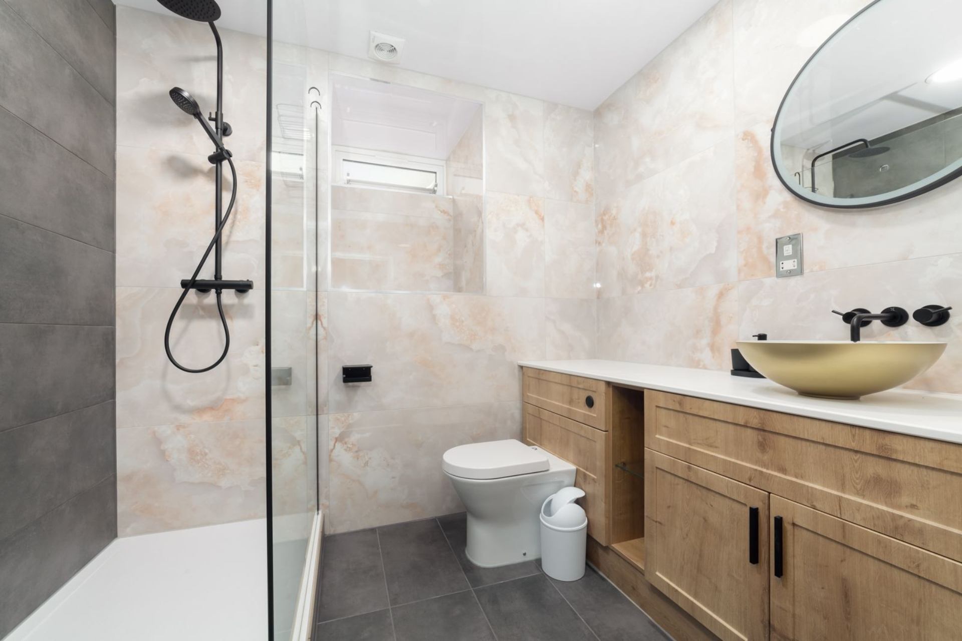 Shower room: Walk-in shower with rainfall head, WC, wash hand basin with vanity unit and heated towel rail