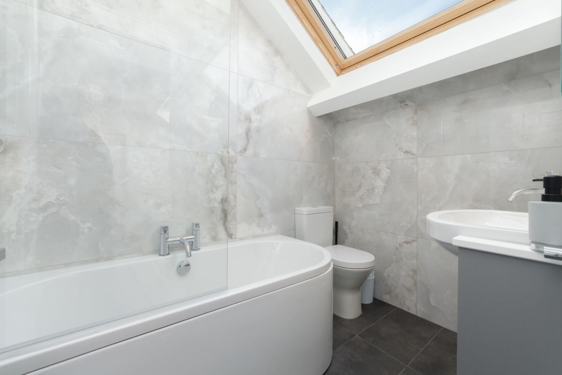Bathroom: Bath with shower over, WC and basin