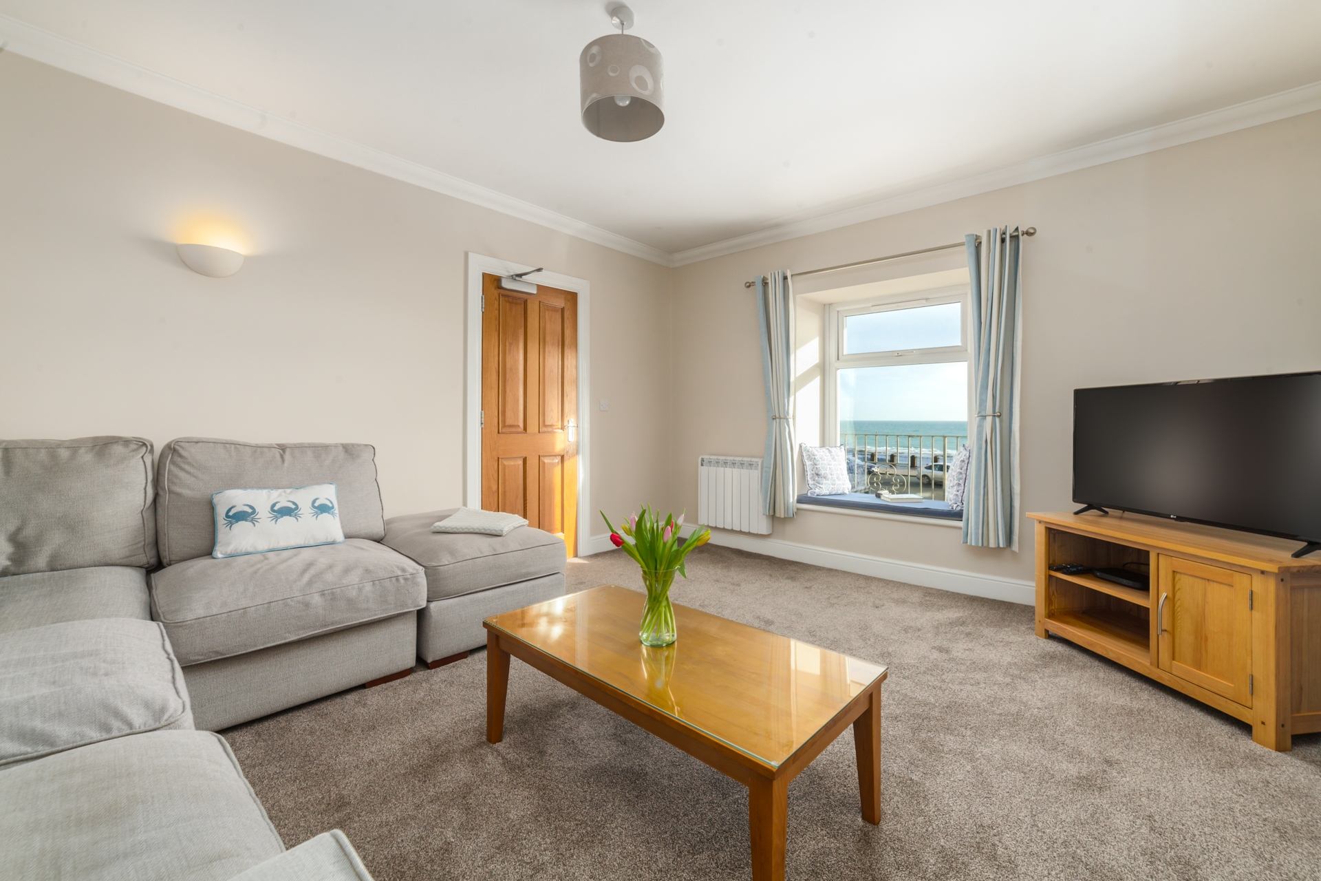 Lounge: Cosy lounge featuring a large corner sofa, a TV unit, coffee table, all complemented by beautiful sea views. A sofa bed is available to book at an additional charge