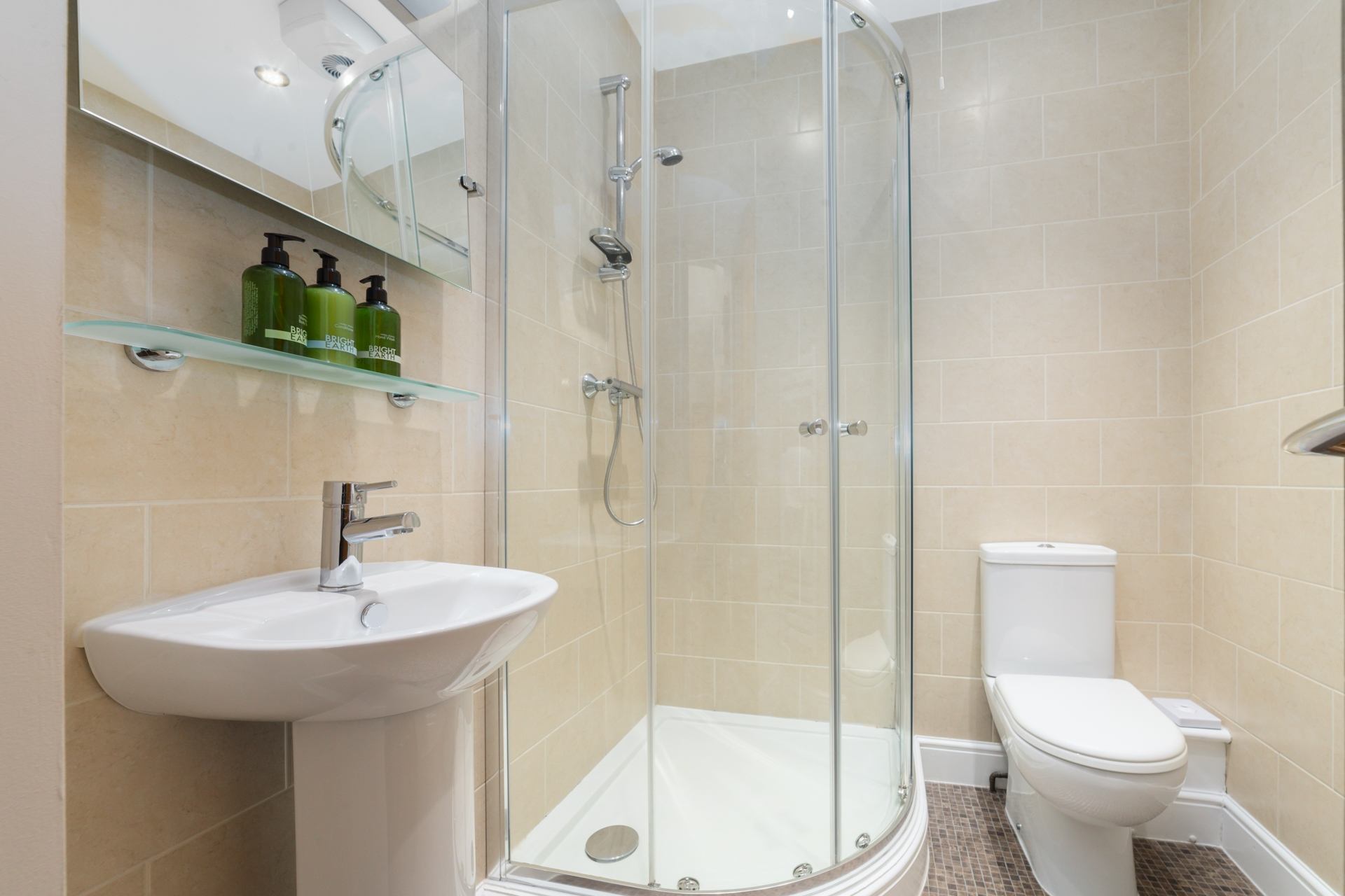 En-suite: Shower cubicle, WC, hand basin, and heated towel rail