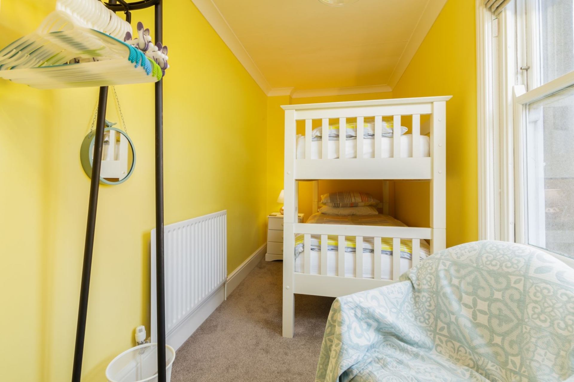 Bedroom 4: Adult bunk beds, bedside cabinet, hanging rack, chair.