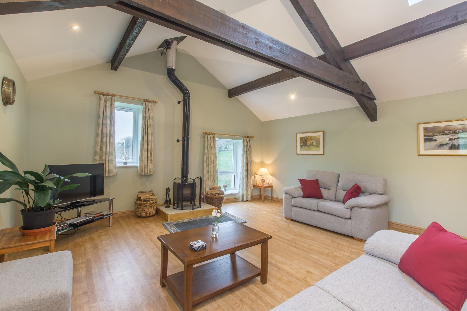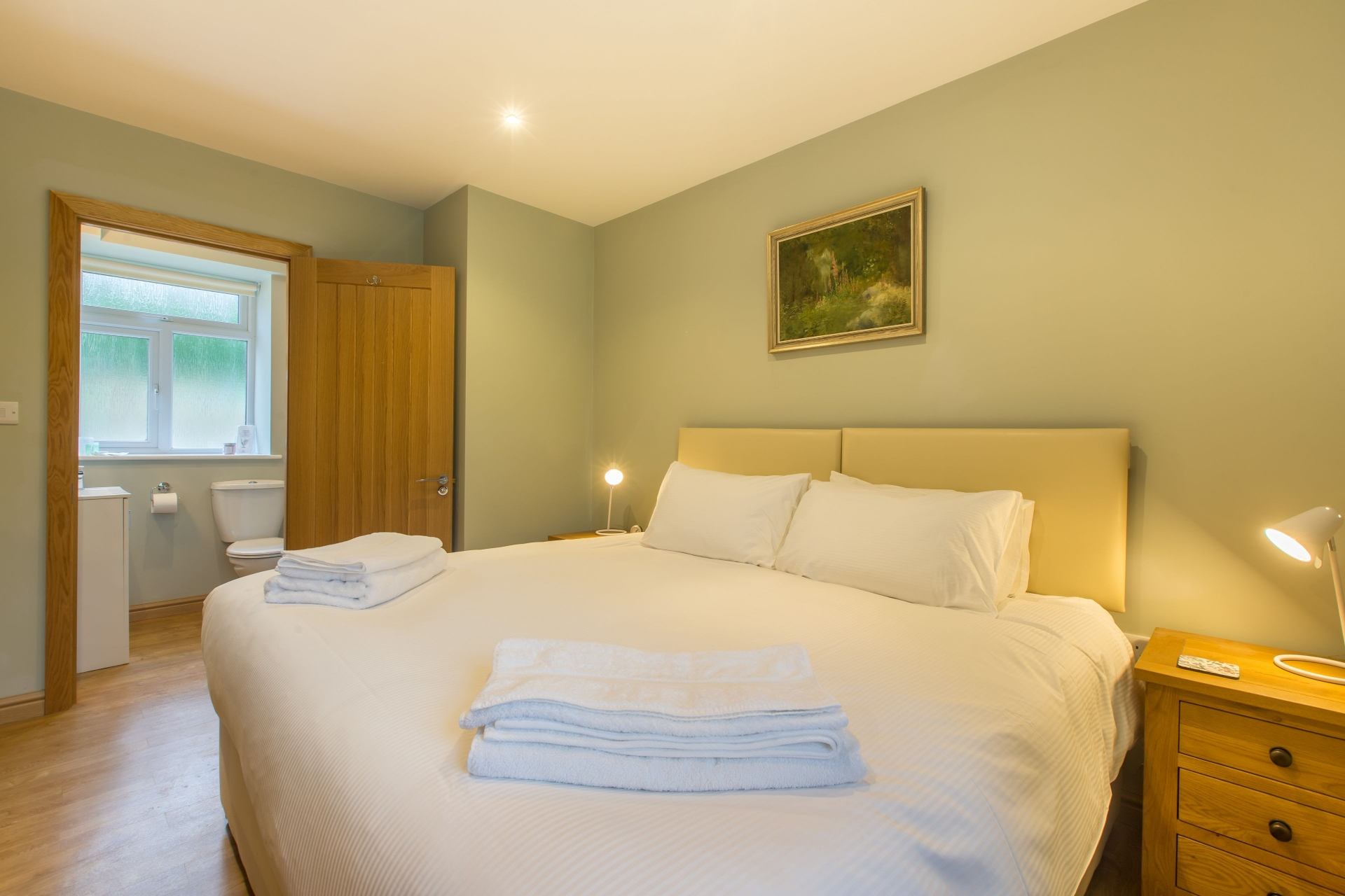 Book nowThe Swallows sleeps six people in three bedrooms, which are on the ground floor. Two of the bedrooms can be configured either as a super-kingsize double room, or as a twin bedroom. The first floor offers beautiful countryside views with a fully equipped kitchen/dining room, and a large high ceiling living room with exposed beams and a wood burning stove. There is underfloor heating powered by an air source heat pump.