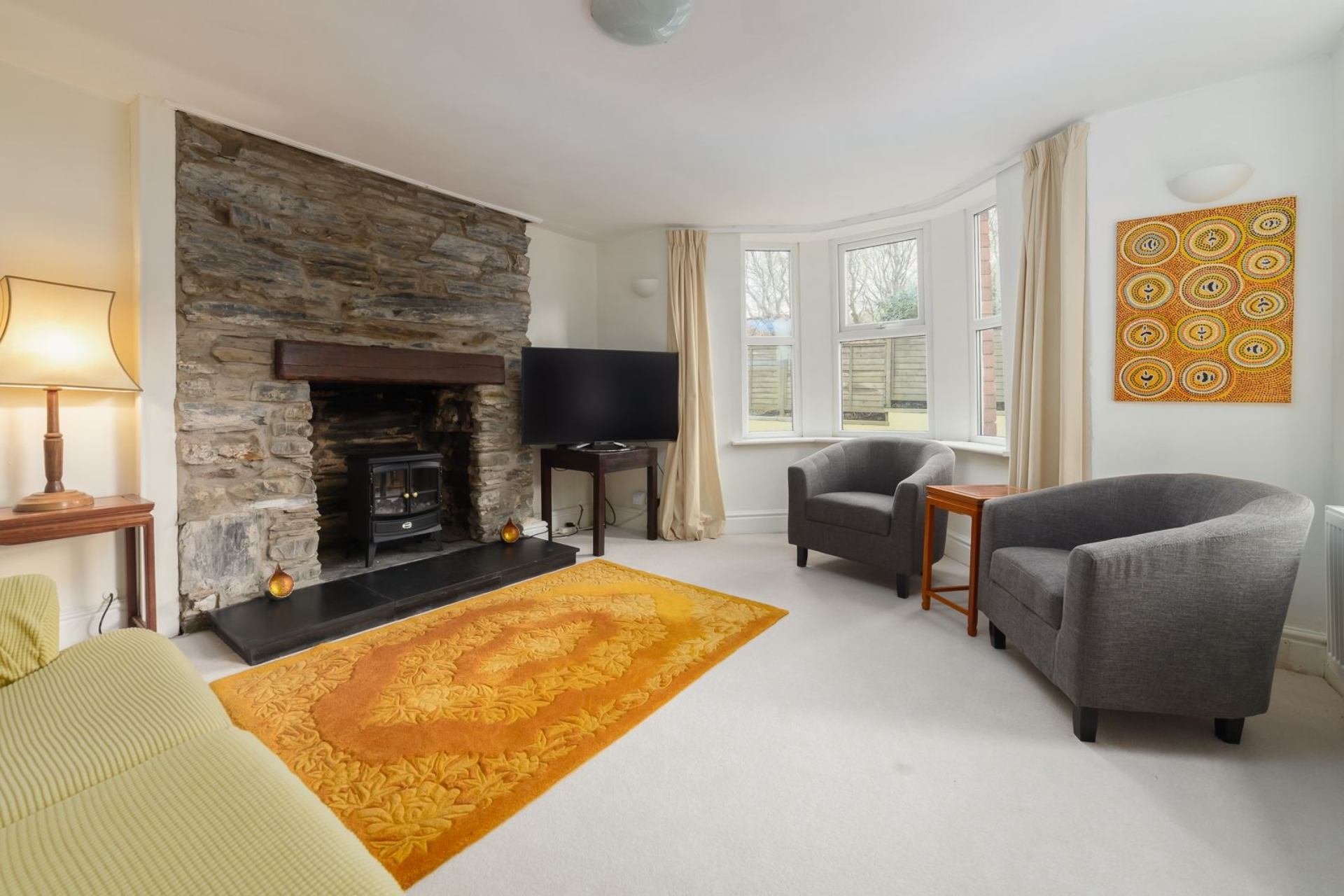 Lounge: Sofa, two armchairs, Smart TV, DVD player, coffee table.