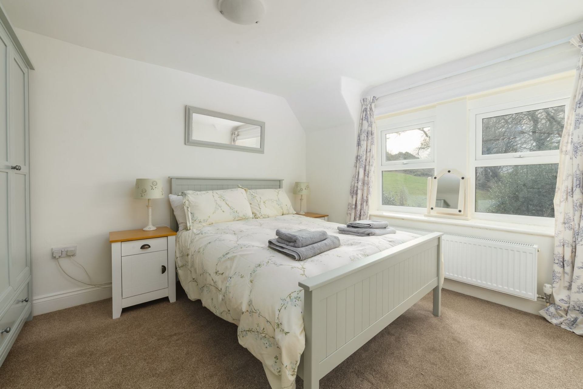 Bedroom 1: Double bed, bedside tables, chest of drawers, wardrobe