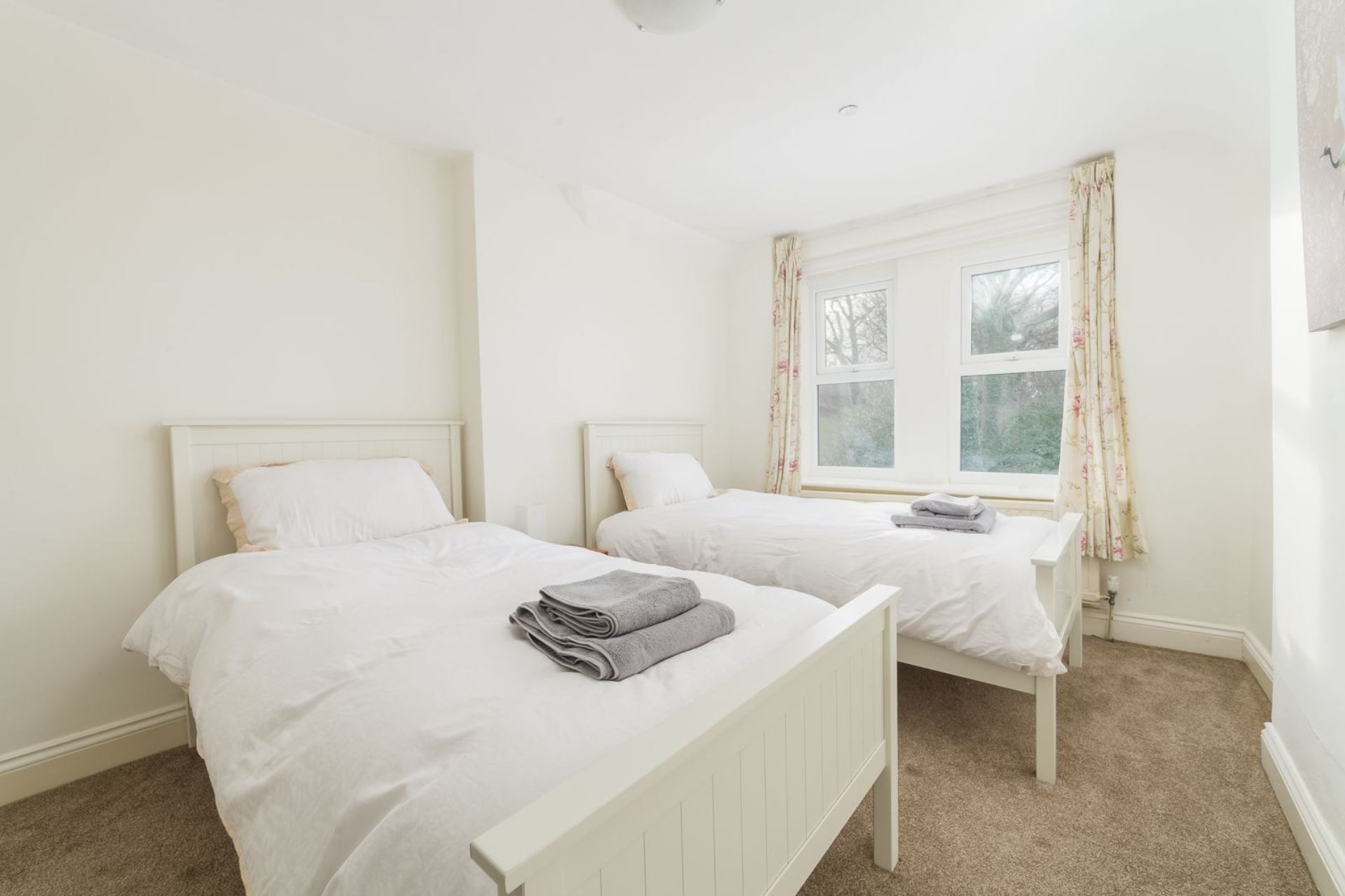 Bedroom 2: Twin beds, bedside table, chest of drawers, wardrobe