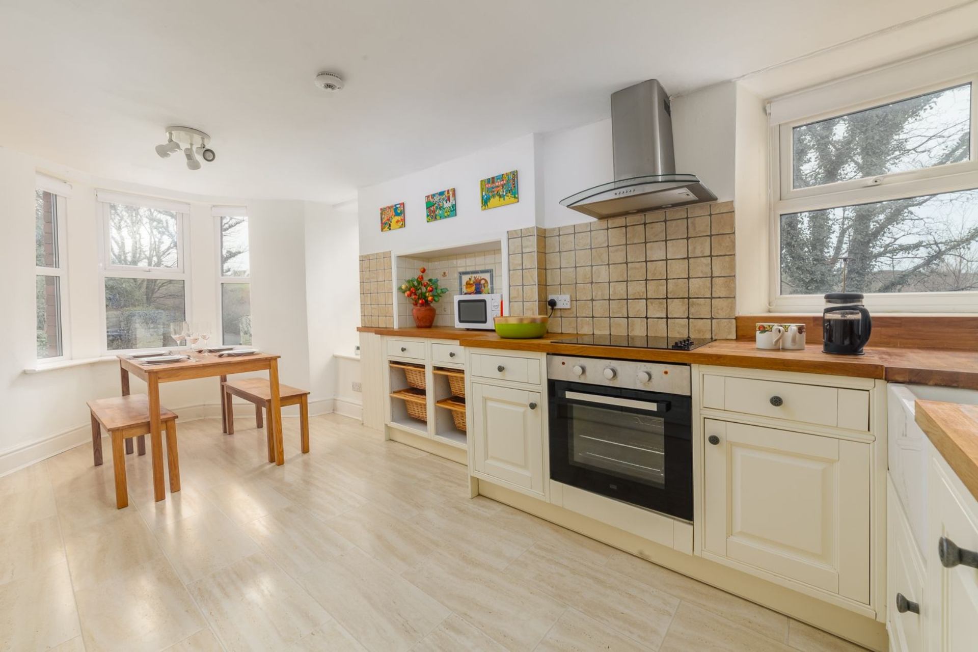 Kitchen/Dining area: Oven, hob, fridge, freezer, dishwasher, microwave, dining table & two benches
