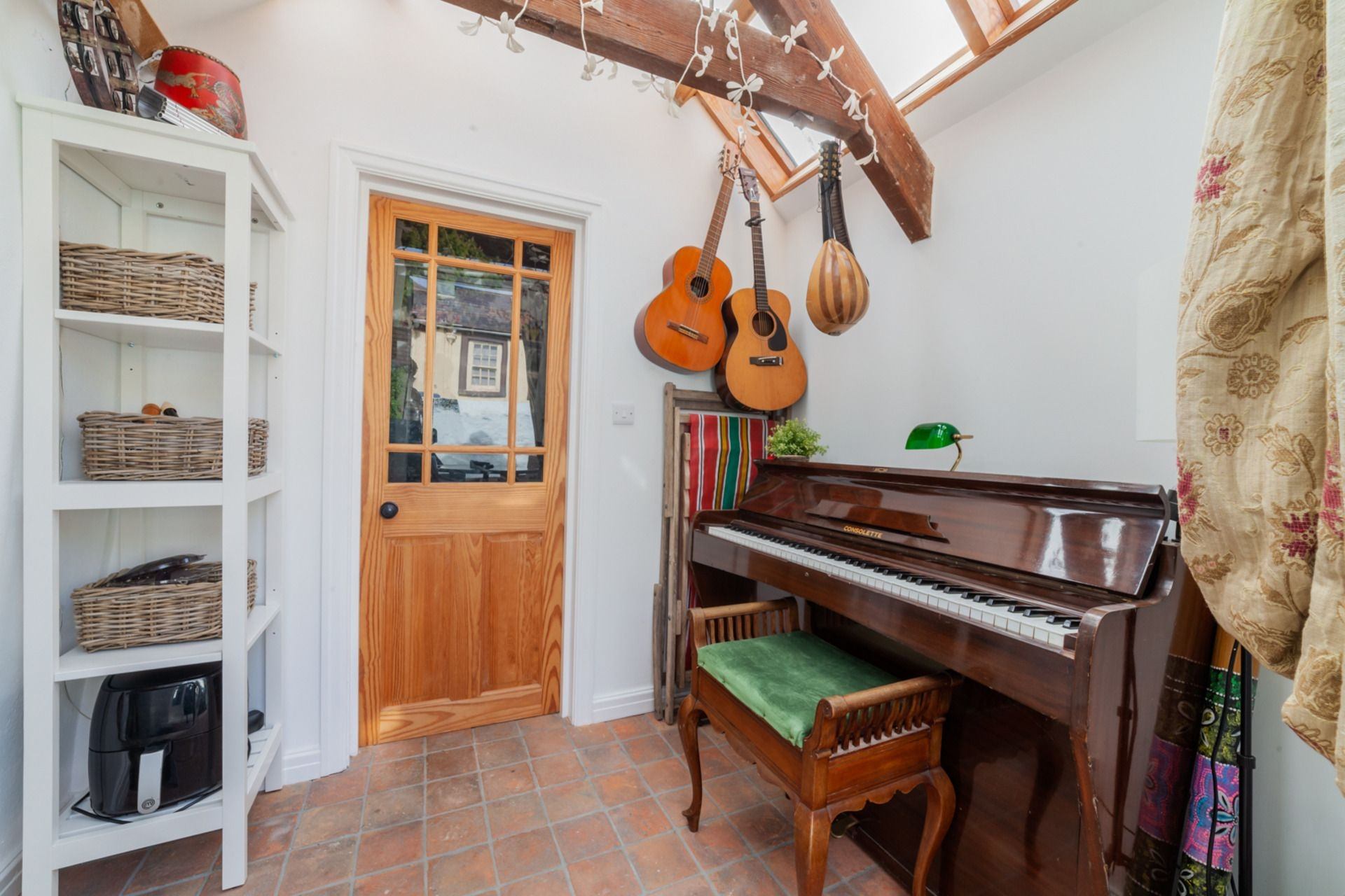 Conservatory: Raised room accessed via three steps, containing a piano.