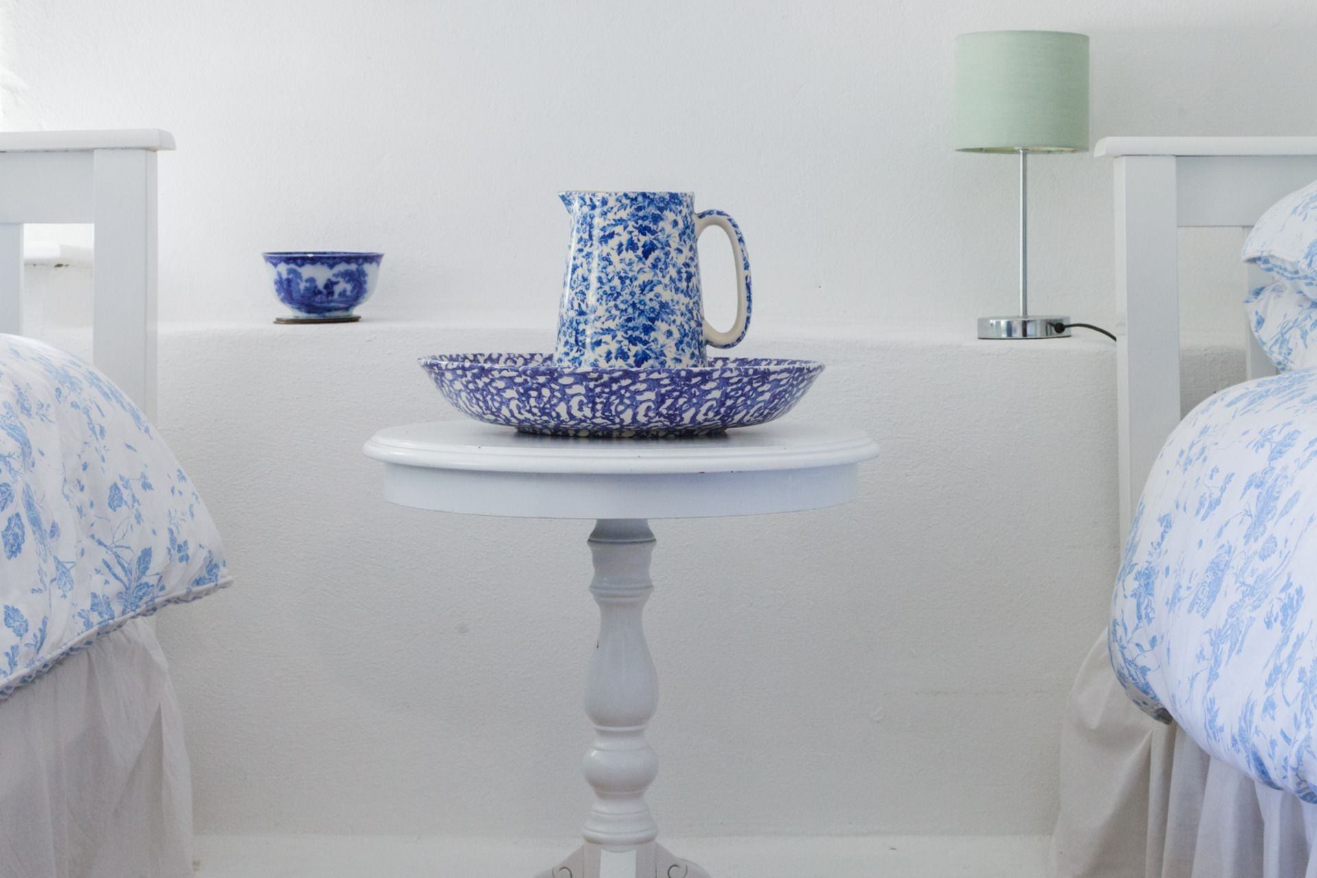 Bedroom 1: Twin beds, bedside table and dressing table.