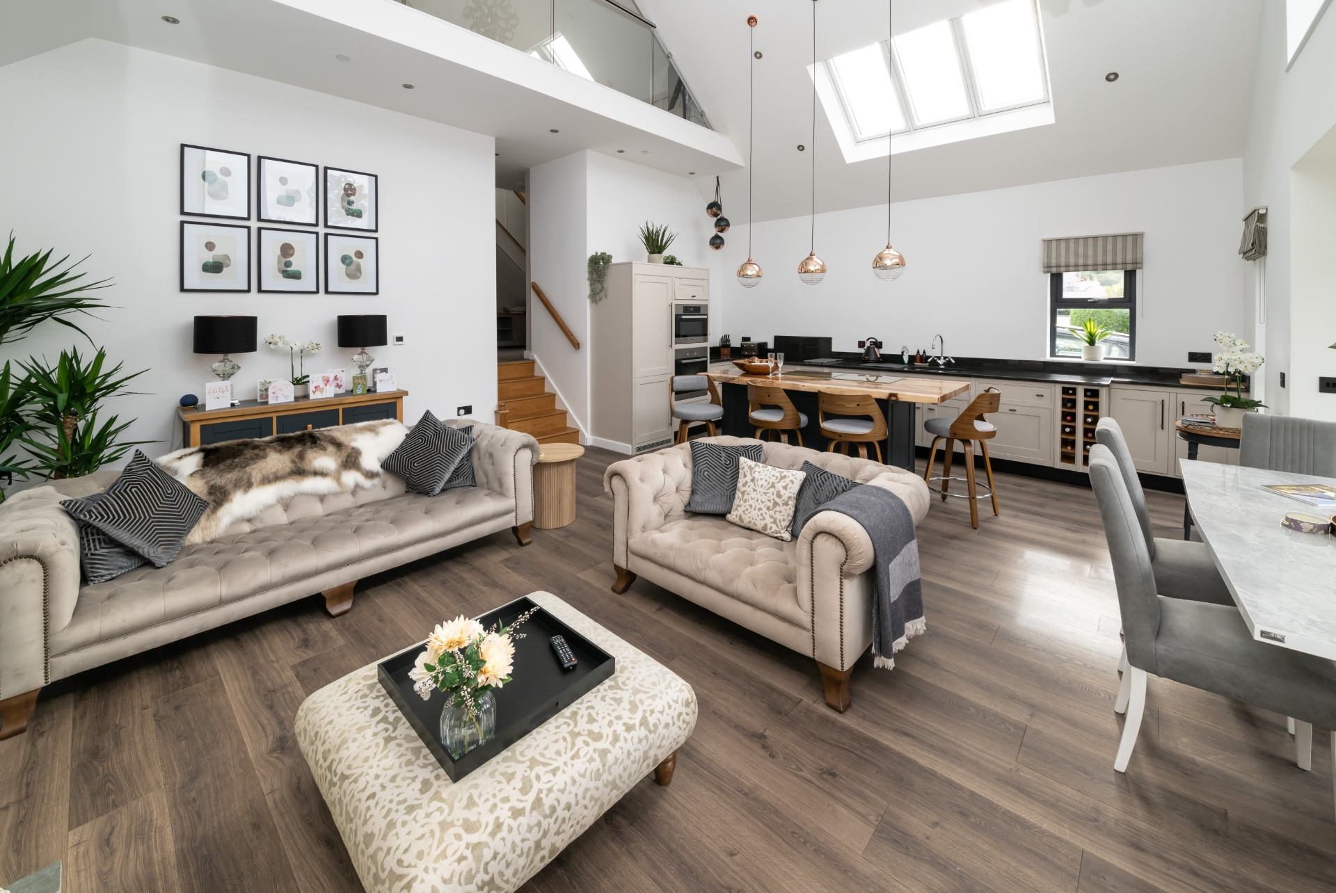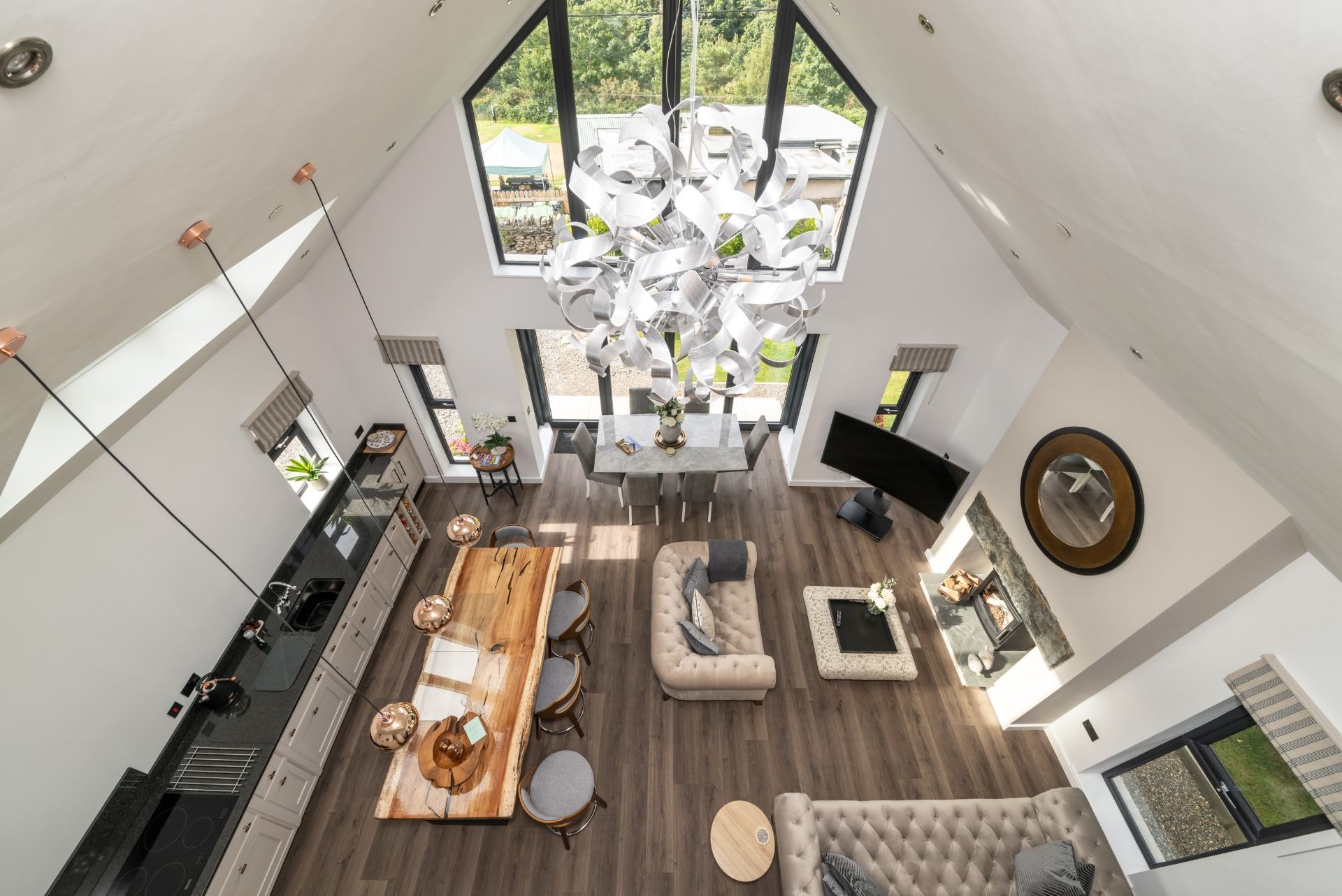 At its heart lies a breathtaking double-height lounge, where vaulted ceilings and a statement fireplace create a dramatic yet inviting space to unwind. Expansive glazing draws in natural light, enhancing the sense of openness and connection to the surrounding landscape.