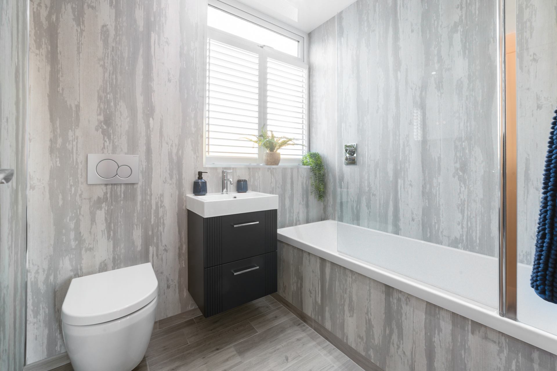 Family bathroom: Bath with shower over, WC, hand basin with vanity unit, LED mirror