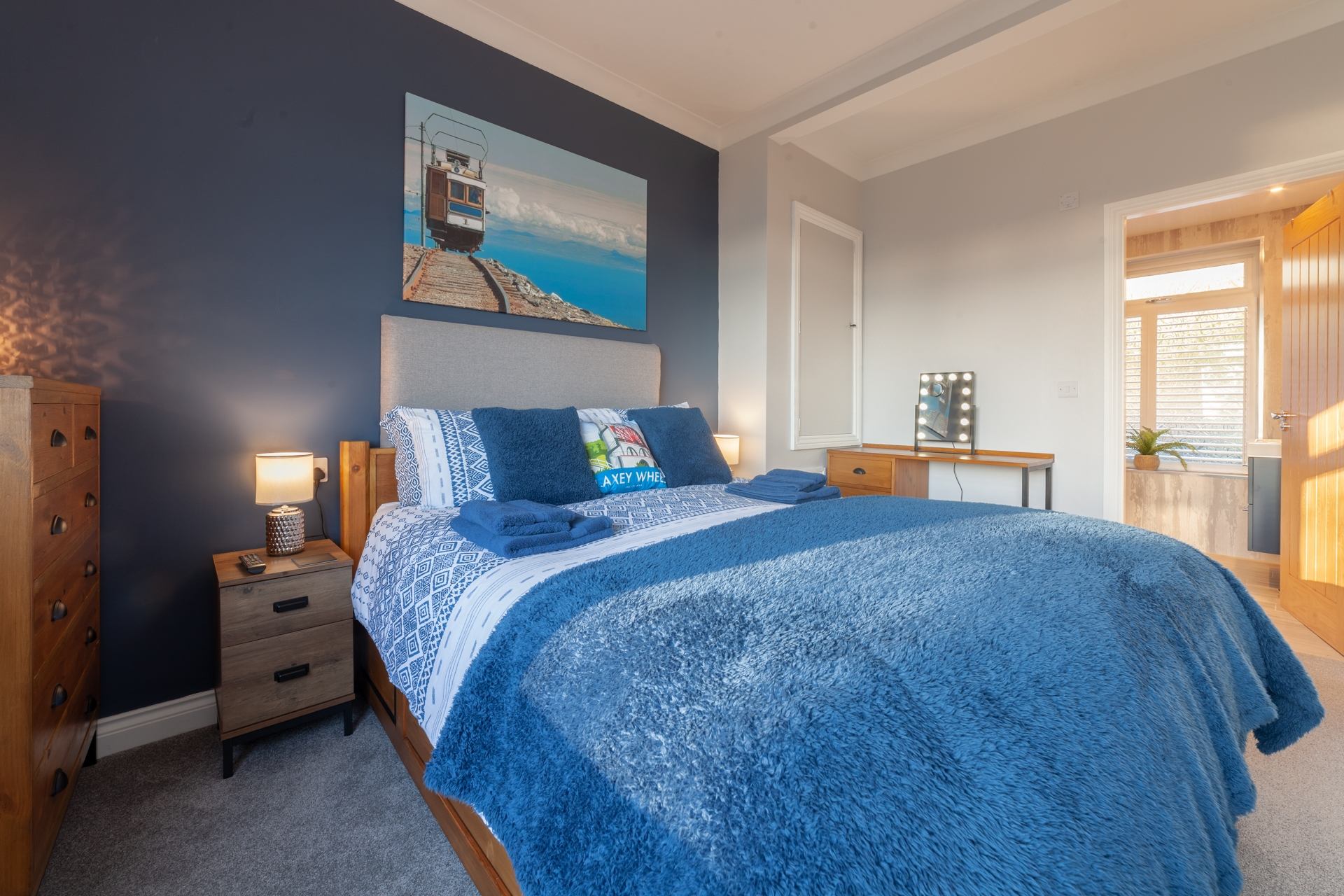 Bedroom 1: Double bed with en-suite and storage, wrapped in sea and tram views.