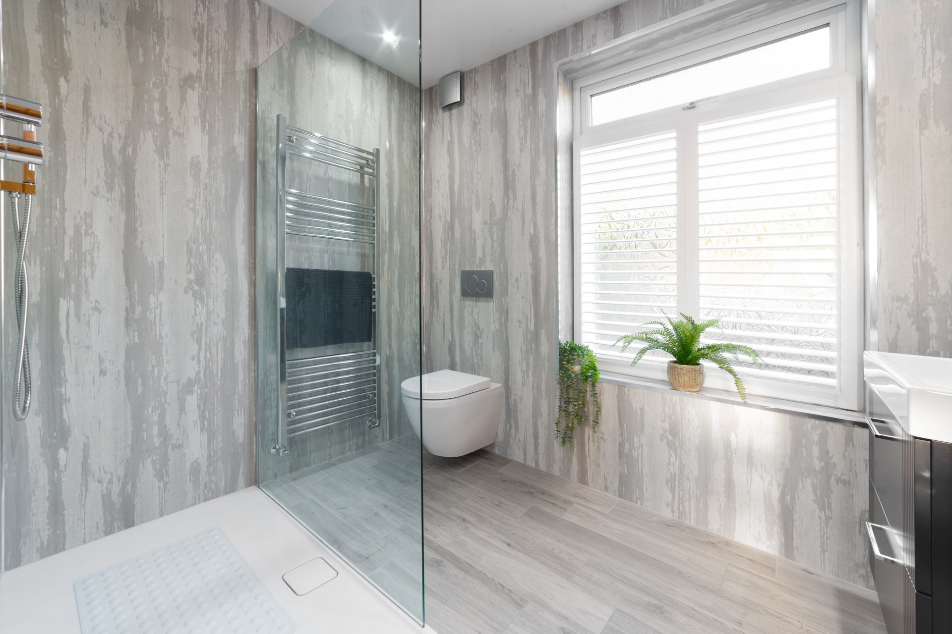 Ensuite bathroom: Modern large walk-in shower, WC, hand basin with vanity unit, LED mirror