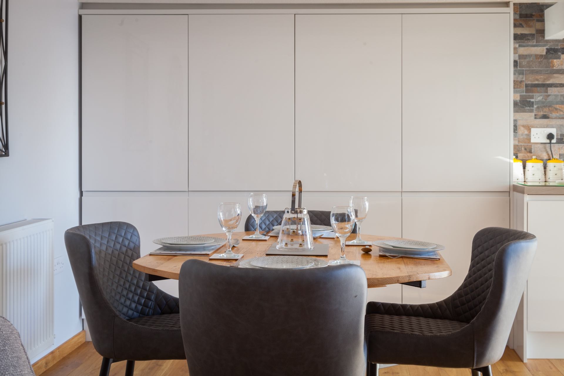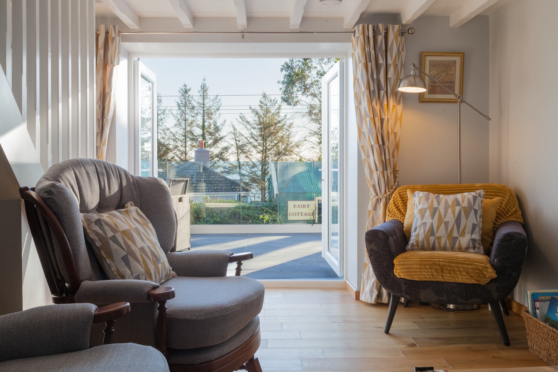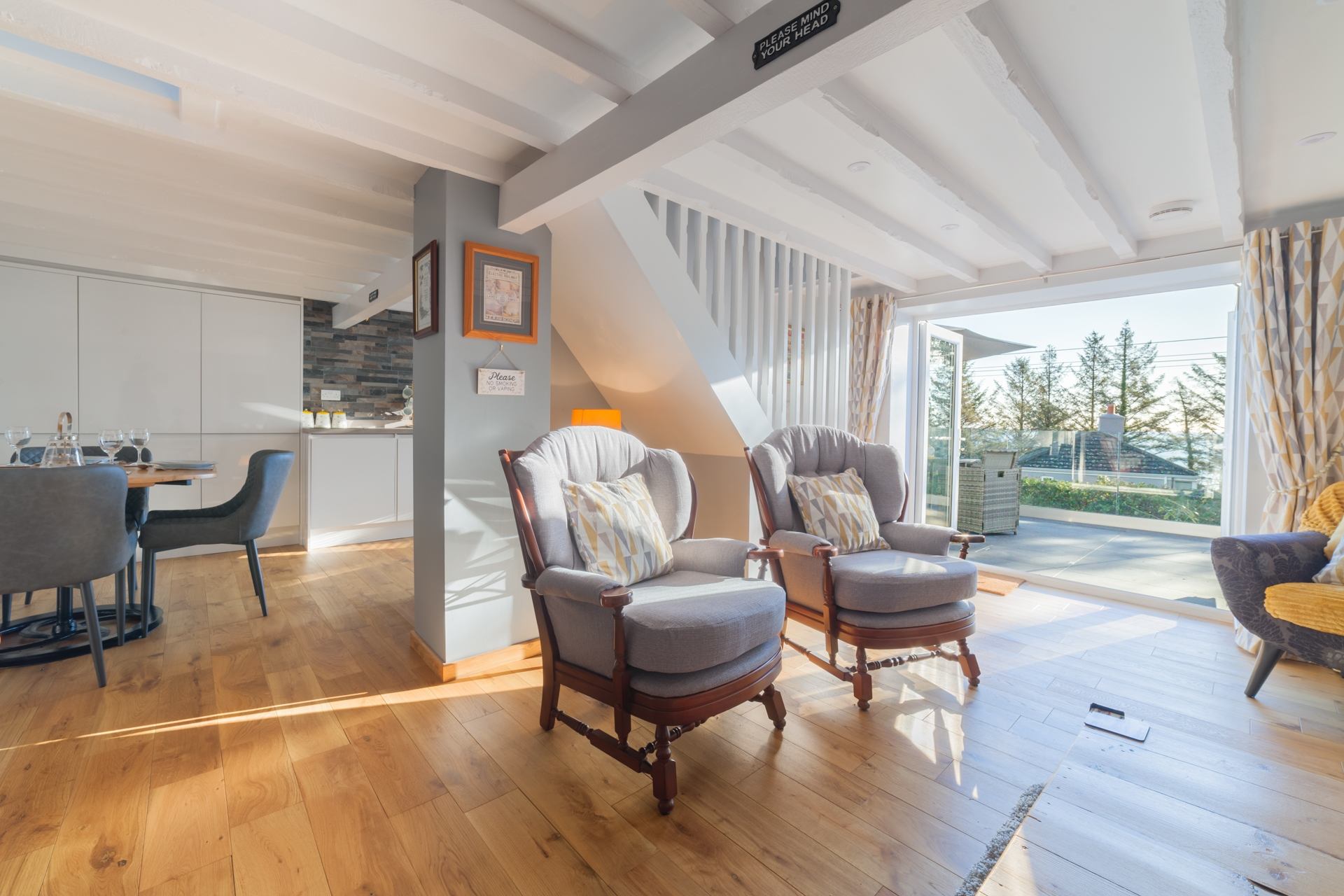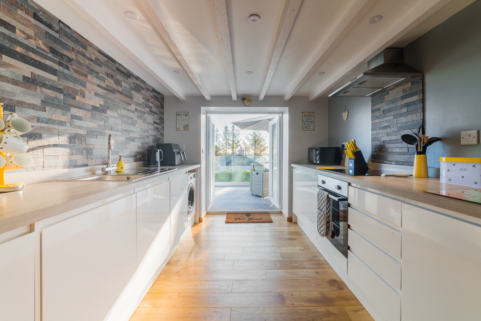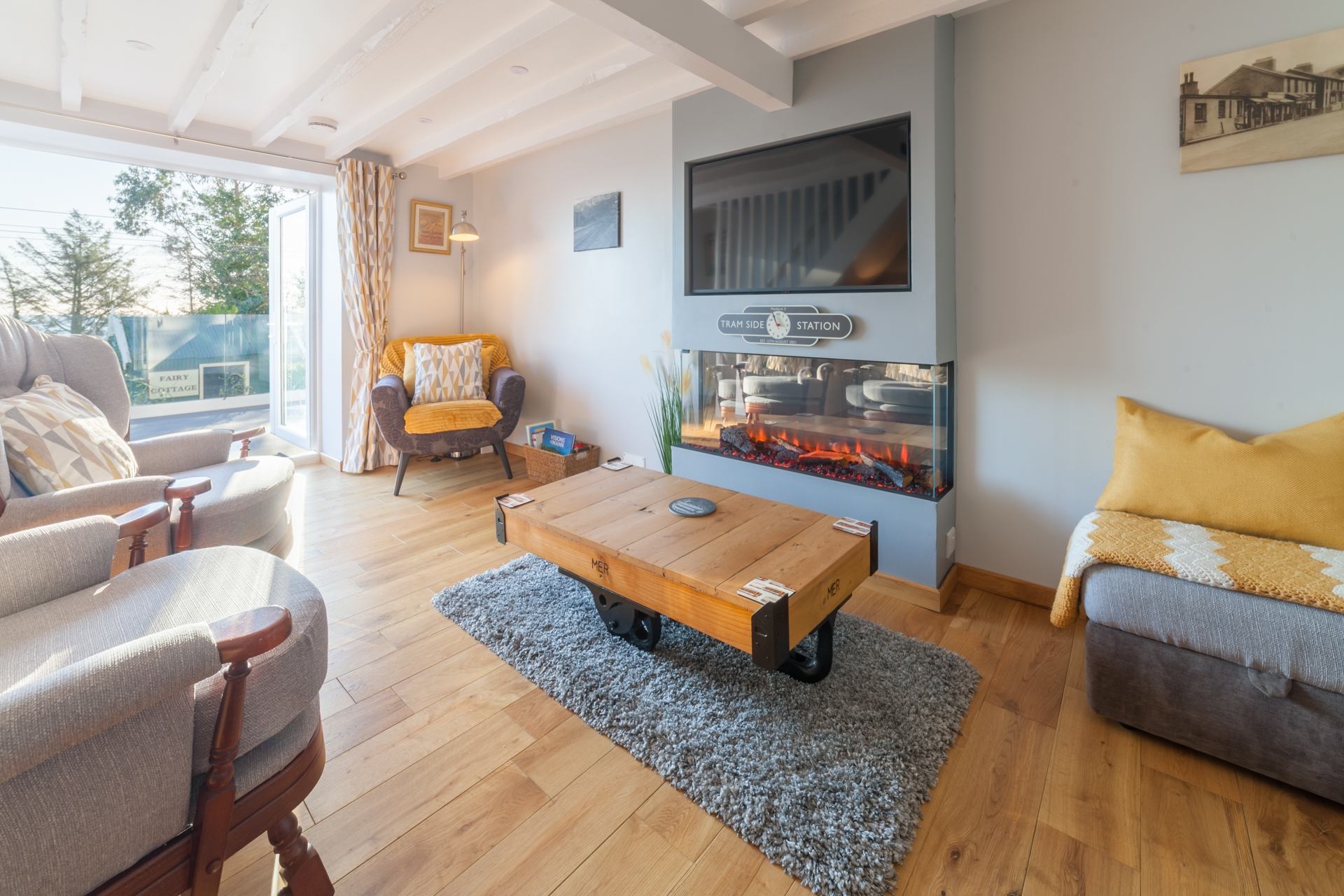 Discover the heart of the home on the ground floor, featuring a welcoming open-plan living space that wraps around the stairs, blending a cosy lounge, chic dining area, and a fully equipped kitchen. Through the patio doors, you’ll find a sun-drenched terrace, perfect for slow moments soaking up rolling countryside, sparkling coastline, and the charming tram tracks of Fairy Cottage Halt.