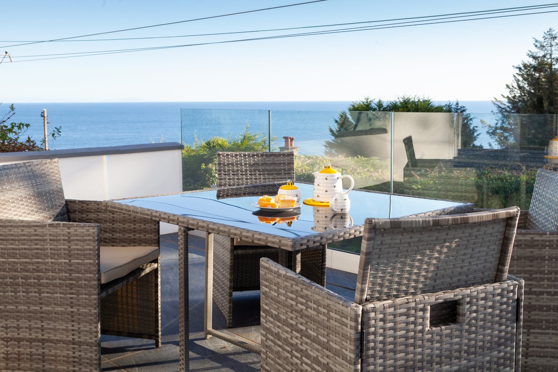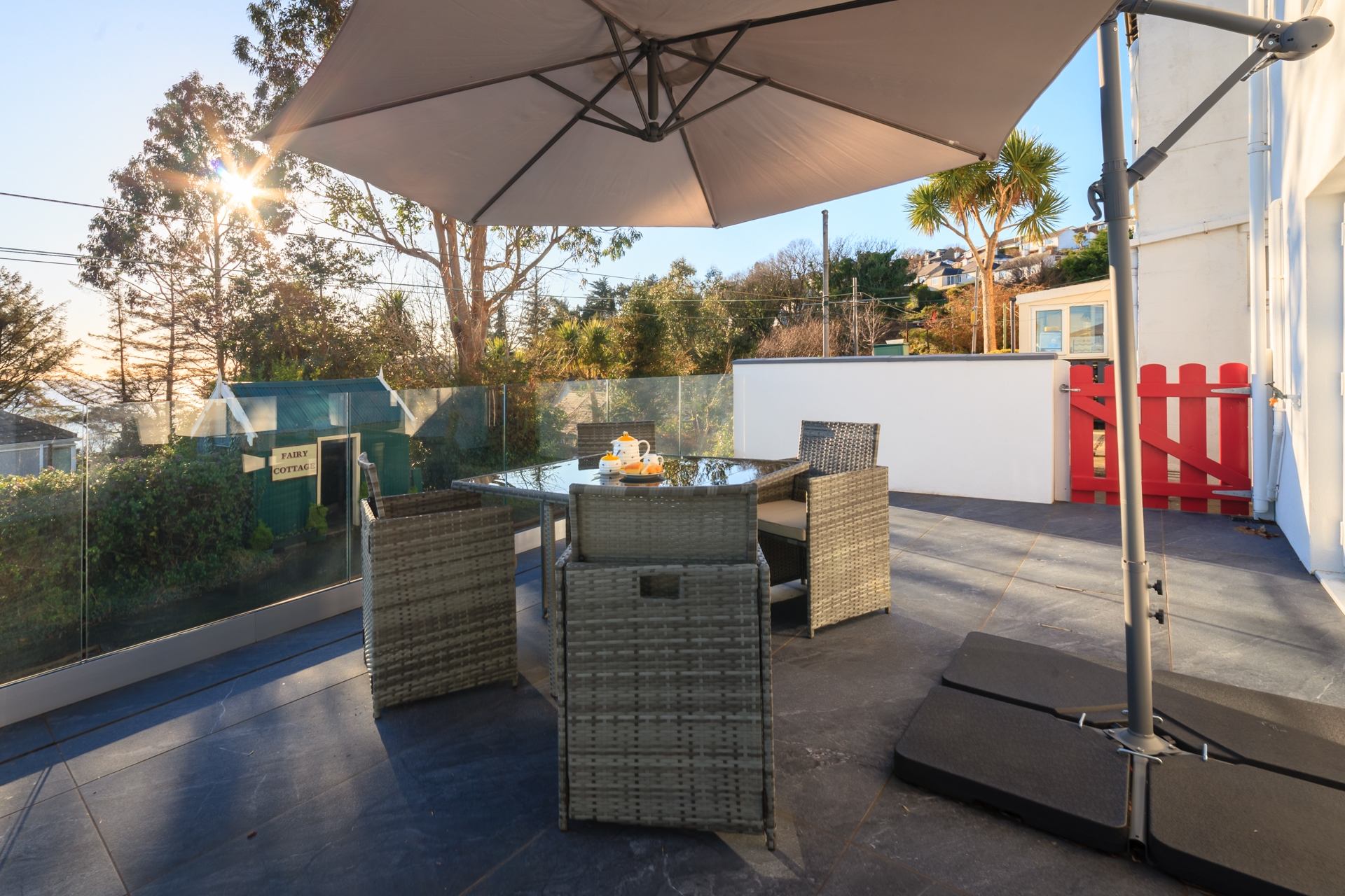 Patio space with outdoor furniture and a parasol with lovely views of the countryside, coastline, and the tram tracks by Fairy Cottage halt.