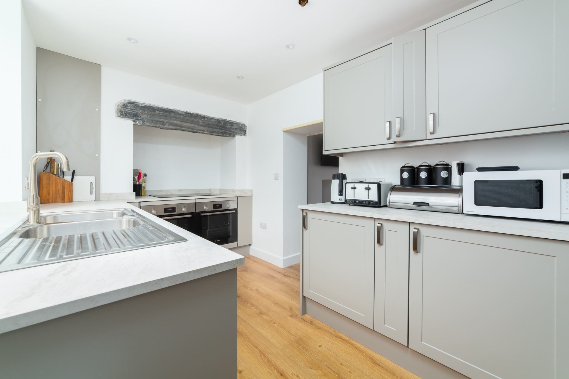 Kitchen/Lounge: Modern fitted kitchen equipped with a dishwasher, fridge/freezer, double oven and hob, and microwave. In the lounge, there is a sofa with a TV unit