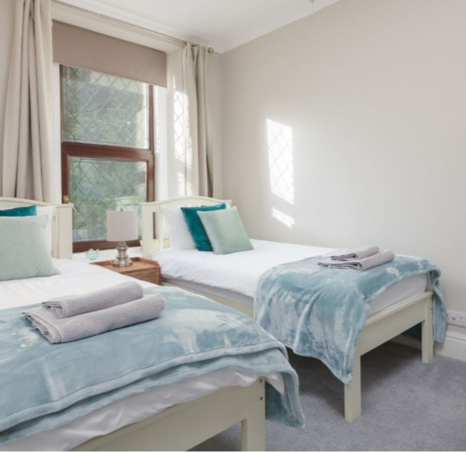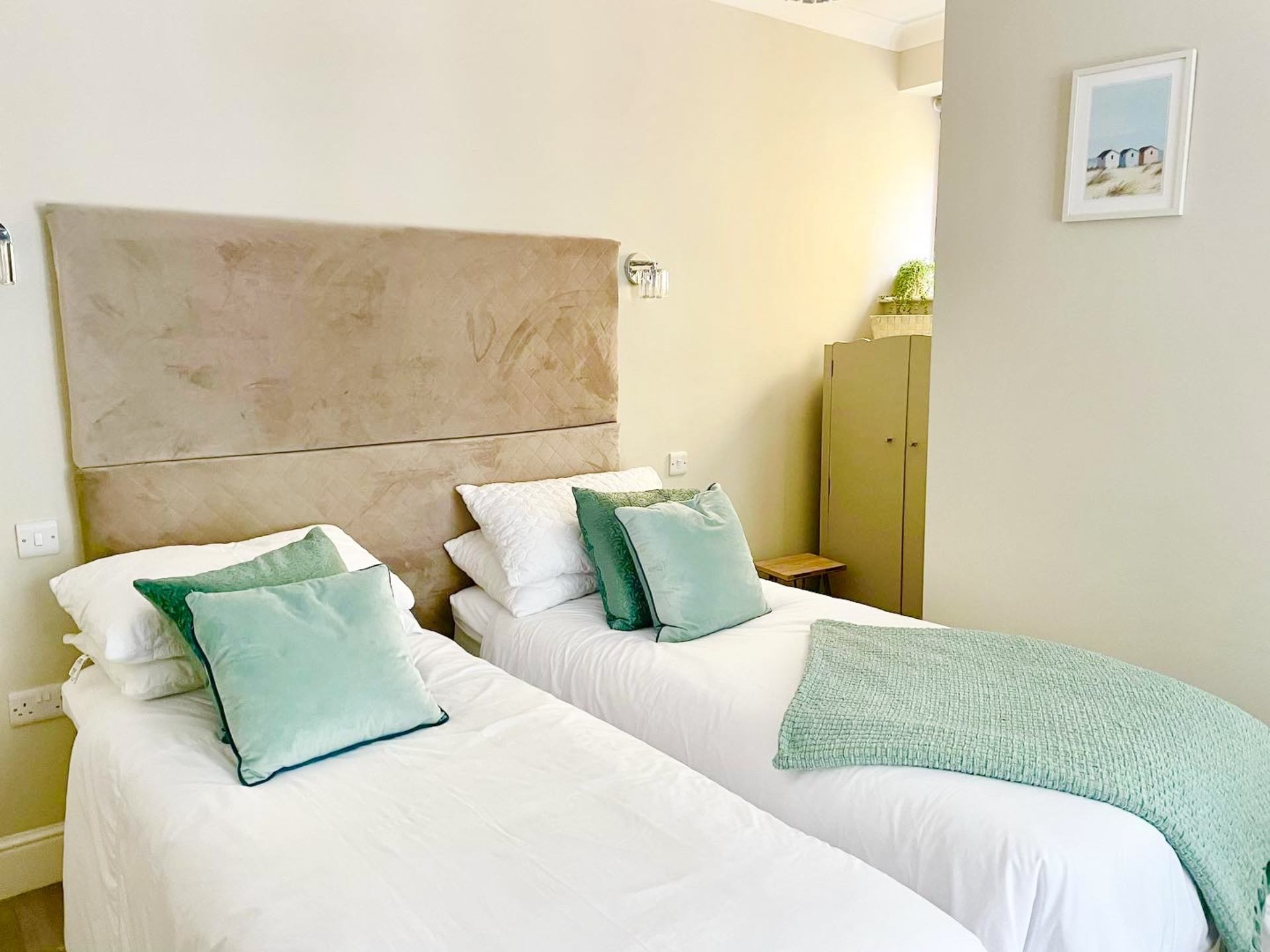 Bedroom 2: Twin beds, bedside cabinets, wardrobe with double drawer space.