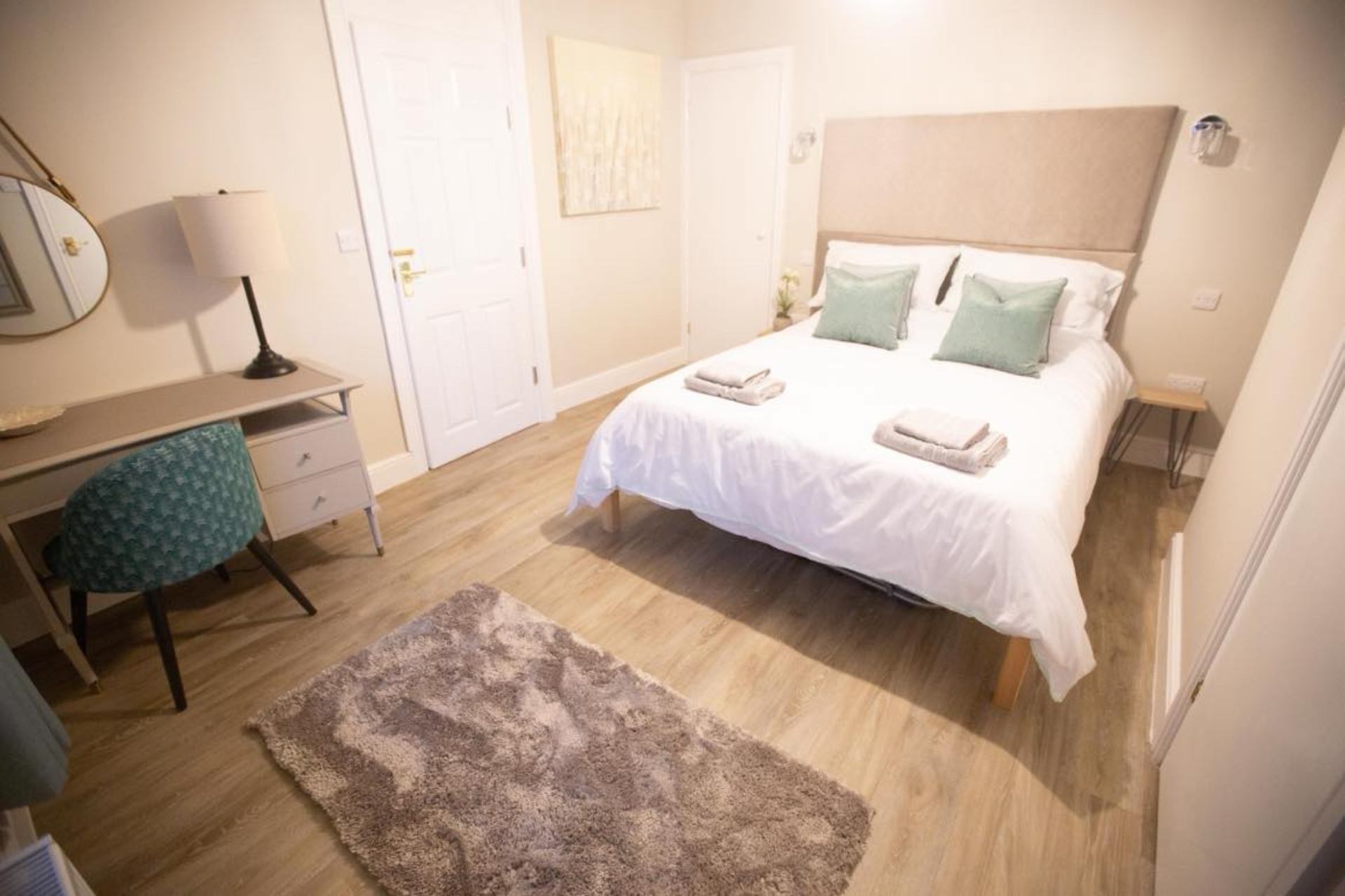 Bedroom 1: King size bed, bedside cabinets, chest of drawers, wardrobe.