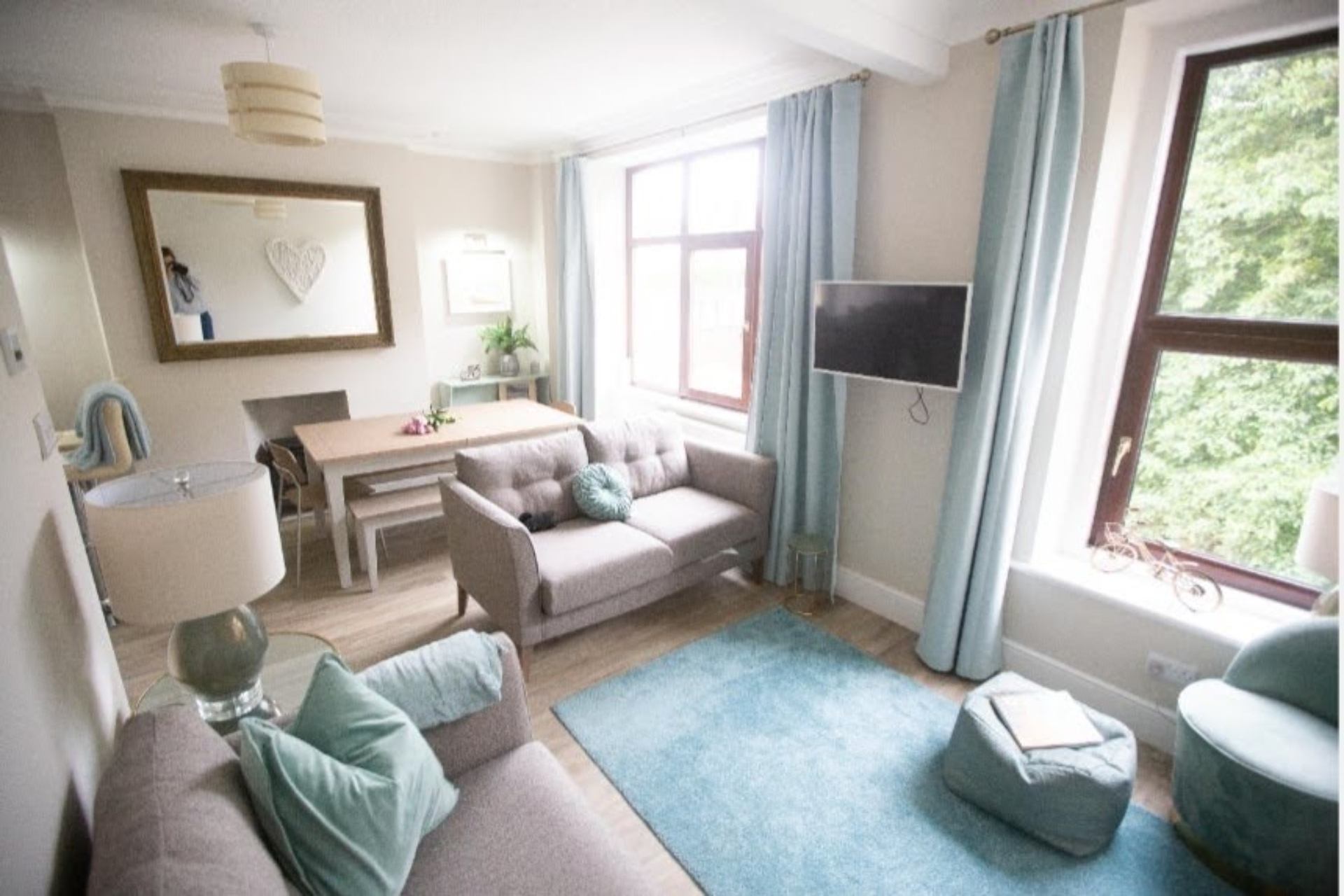 Lounge: Two sofas and a chair providing ample seating for 6 and a Smart TV.