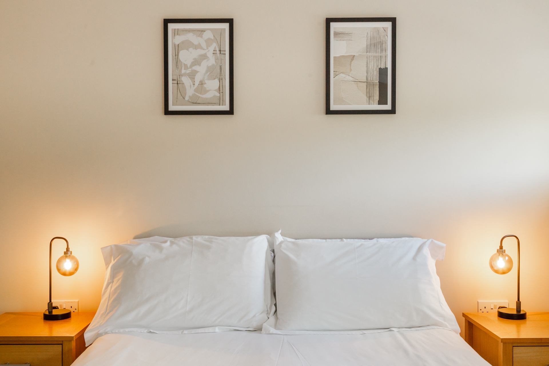 Bedroom 1: Double bed with bedside tables, wardrobe, dressing table and hairdryer.