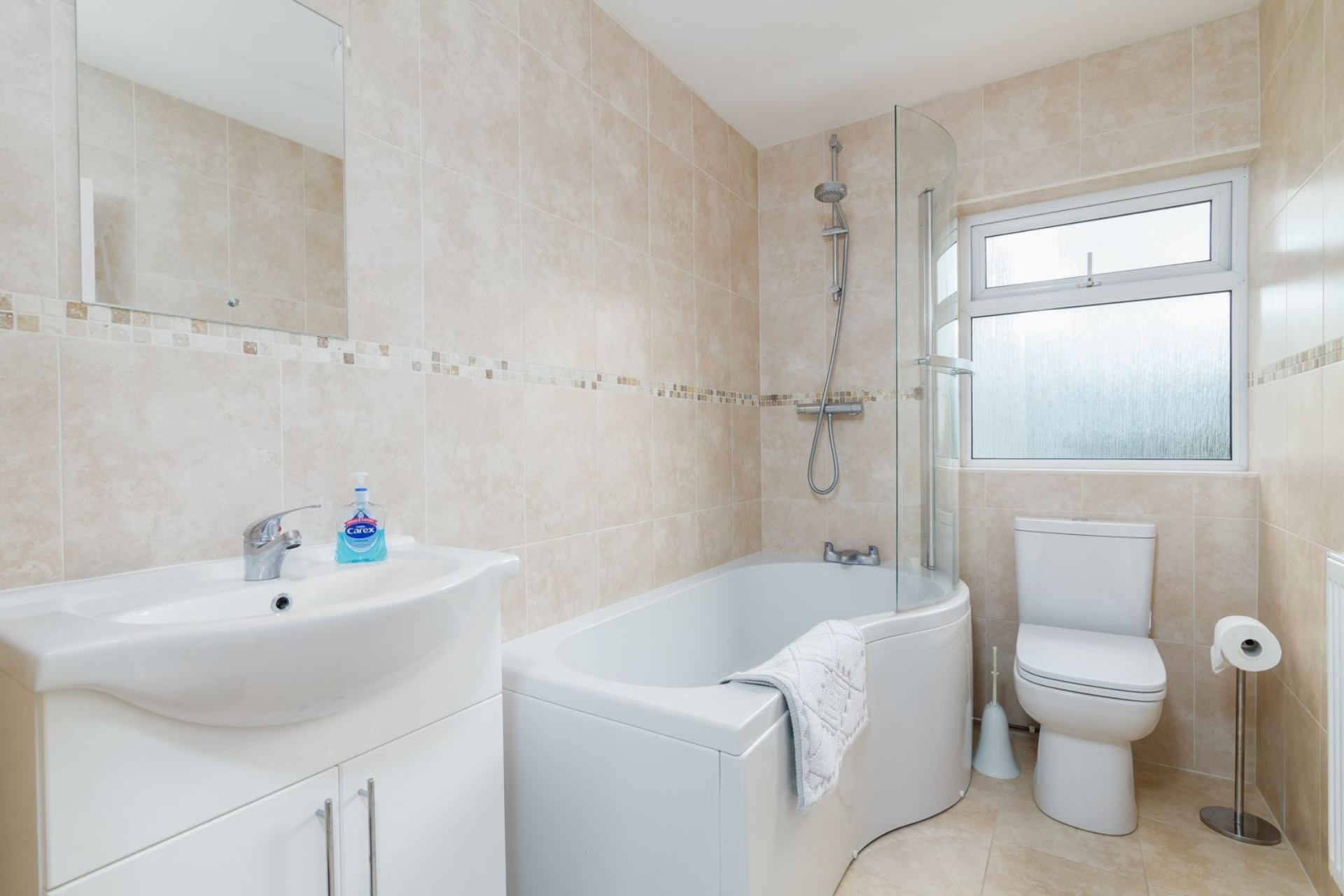 Bathroom: Bath with shower over, w.c., basin.
