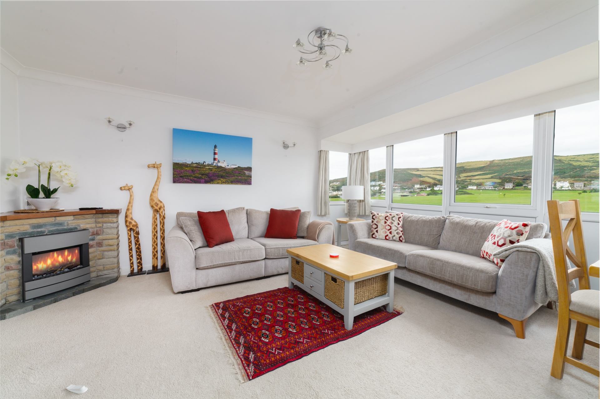 2 Scenic View is perfect in every way. The beds are SO comfortable; the bath is huge, the shower is superb. The kitchen is very well equipped. The oven, microwave, washing machine and tumble dryer are first class; a generous airer is also available. We didn\'t need to use the dishwasher. The only minor fault we found is that the fridge, with its freezer section, would have been more useful if it had been larger. The view from the large windows in the lounge IS truly breathtaking.\nIt is a short walk to a very large, sandy, safe beach. There is also a large lawned area just at the bottom of the road very useful for exercising your dog (if you have one!) when the beach is not available to dogs. Port Erin has plenty of shops, a supermarket, pubs, fish n chips, Chinese, paddle boarding, etc. etc! Port Erin is also the starting point for the steam train into Douglas which is not to be missed. All in all - First Class.