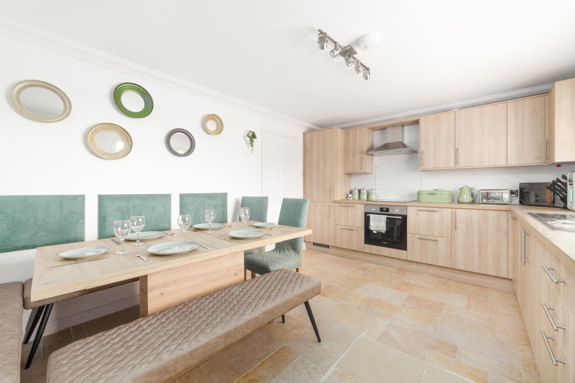 Kitchen and dining area: Well-equipped kitchen with oven, hob, microwave, toaster, coffee machine. The dining area contains a table and seating for 6 people.