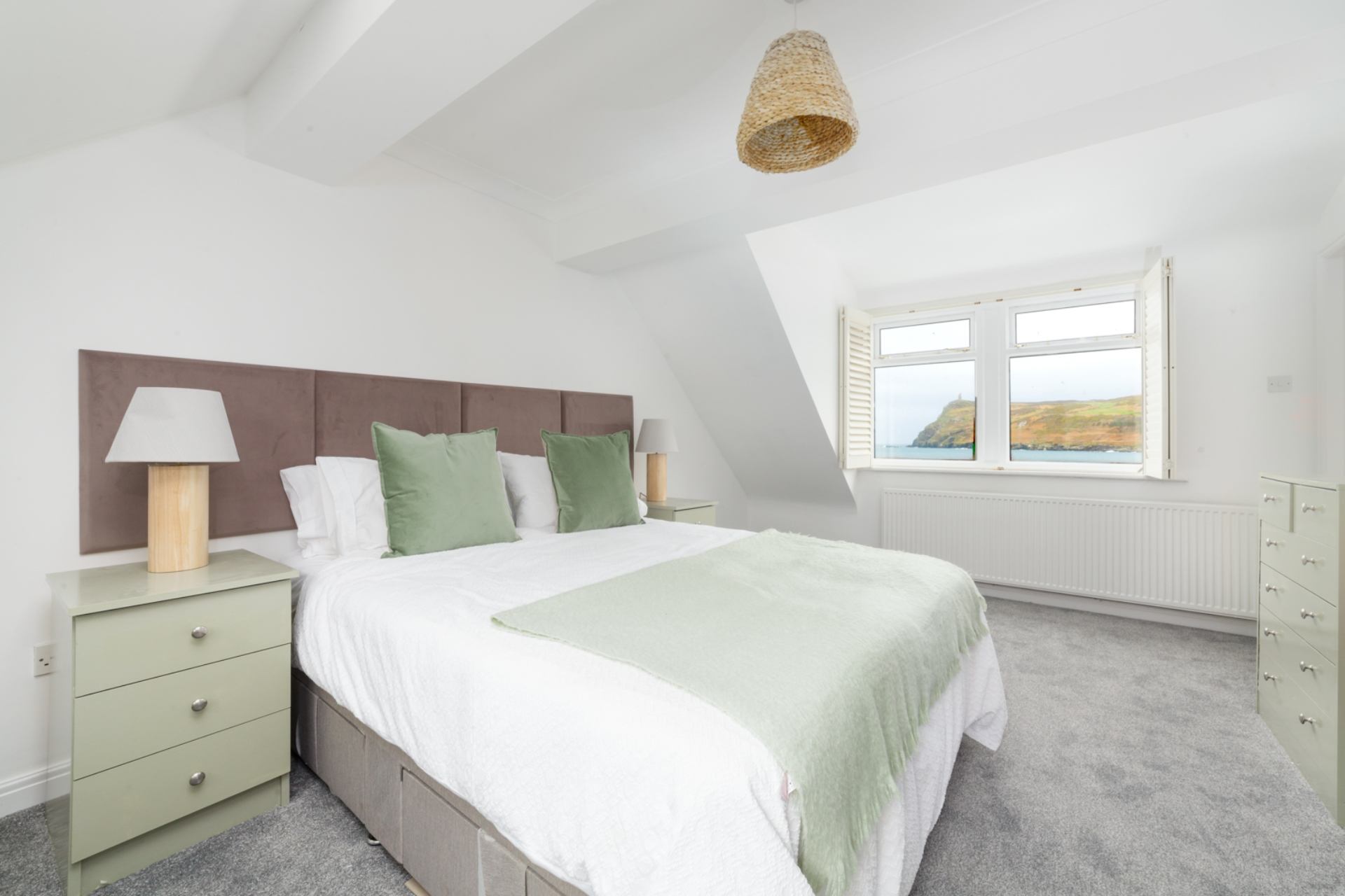 Bedroom 1: Double bed, bedside tables, wardrobe, chest of drawers, sea views.