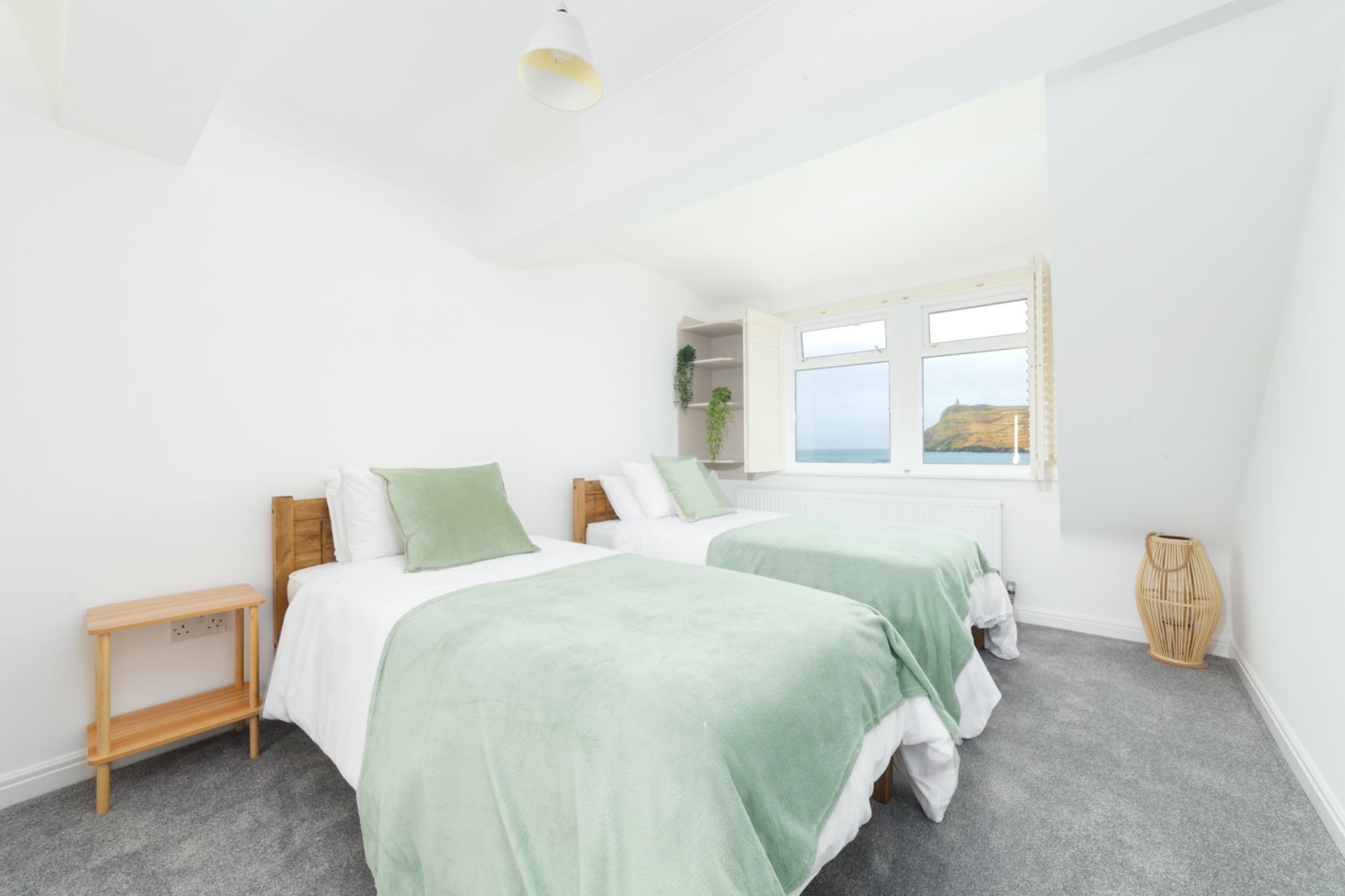 Bedroom 2: Twin beds, bedside tables, wardobe, chest of drawers, sea views.