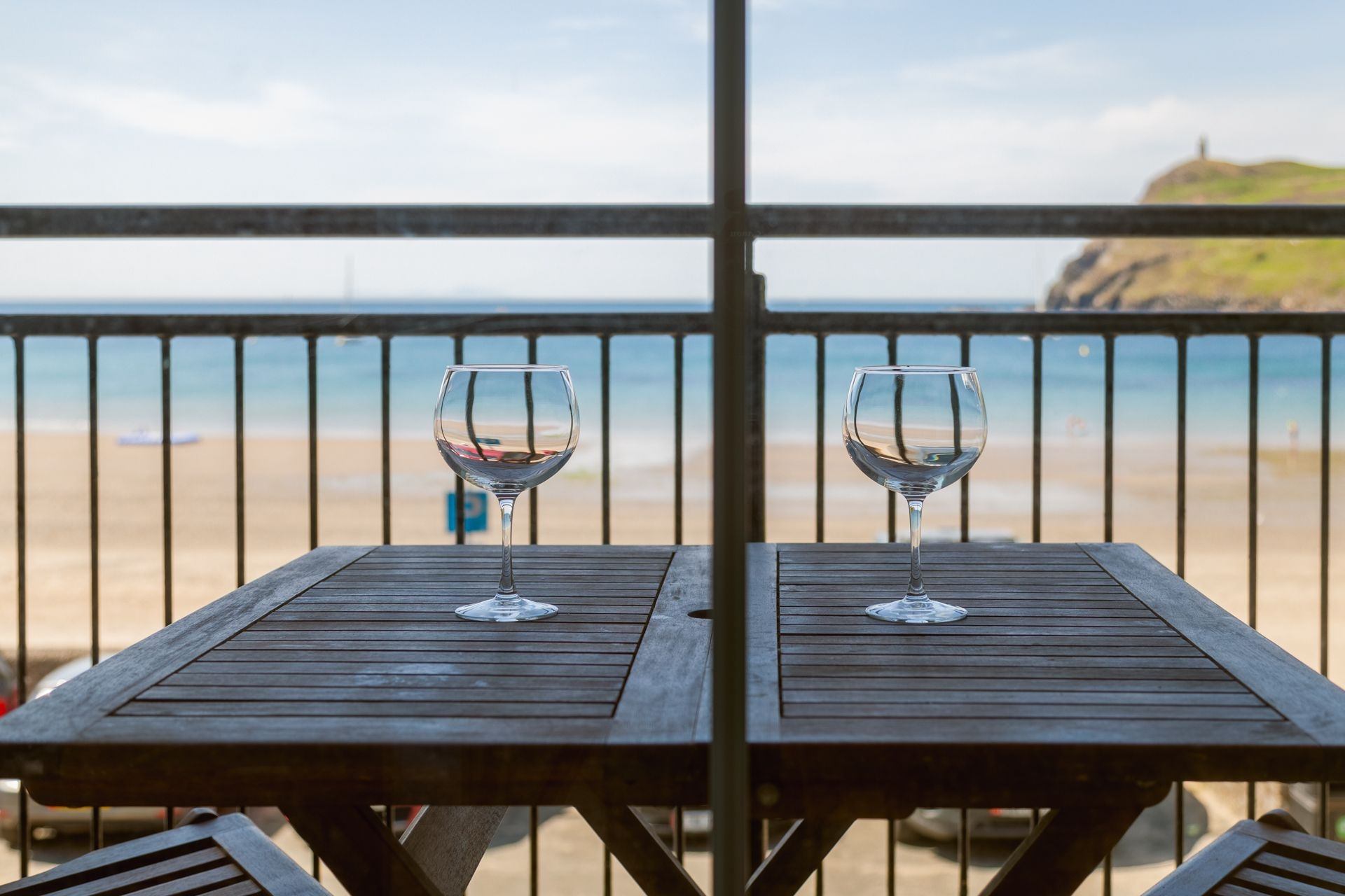 Balcony overlooking beach: Wooden table and four folding chairs.
