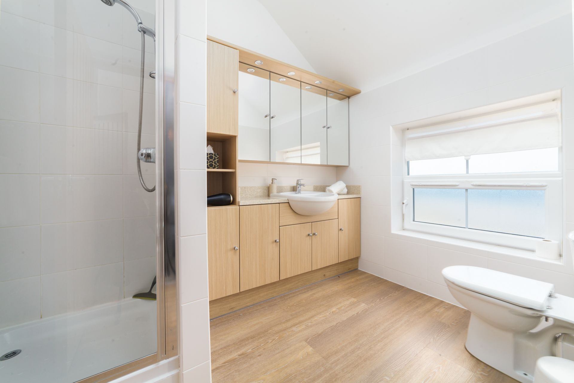 En-suite: Shower with small step WC, wash hand basin in vanity cabinet and large mirror.