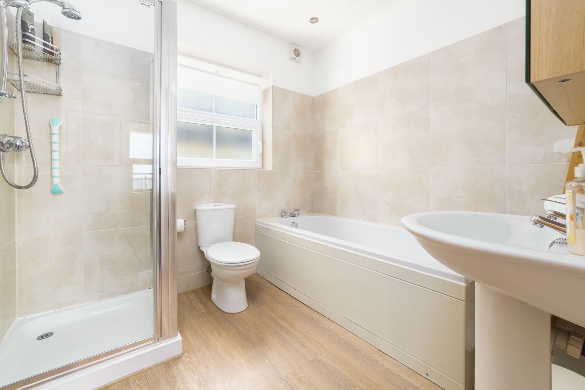 Family Bathroom: Bath, shower with small step, WC, wash hand basin.