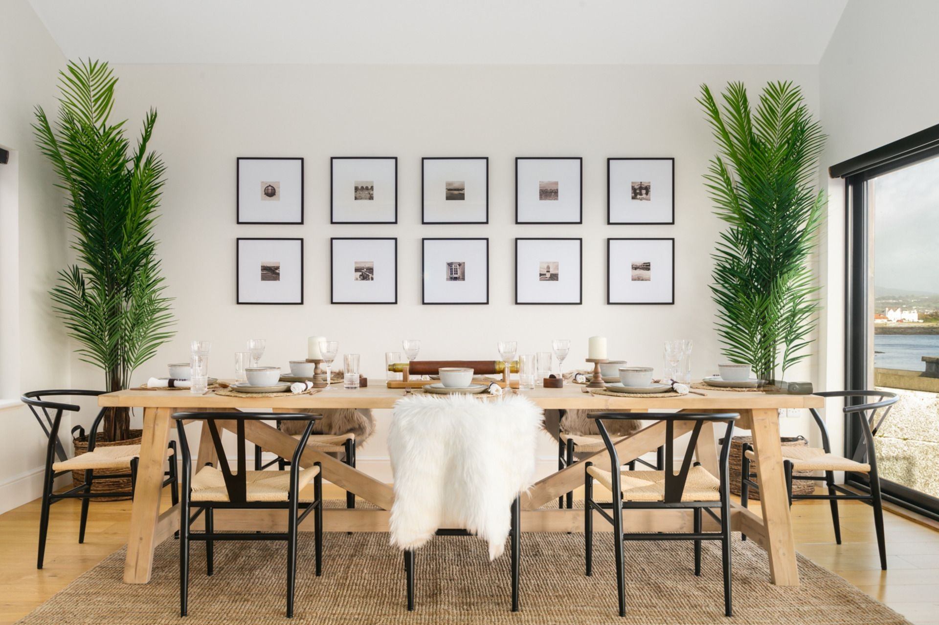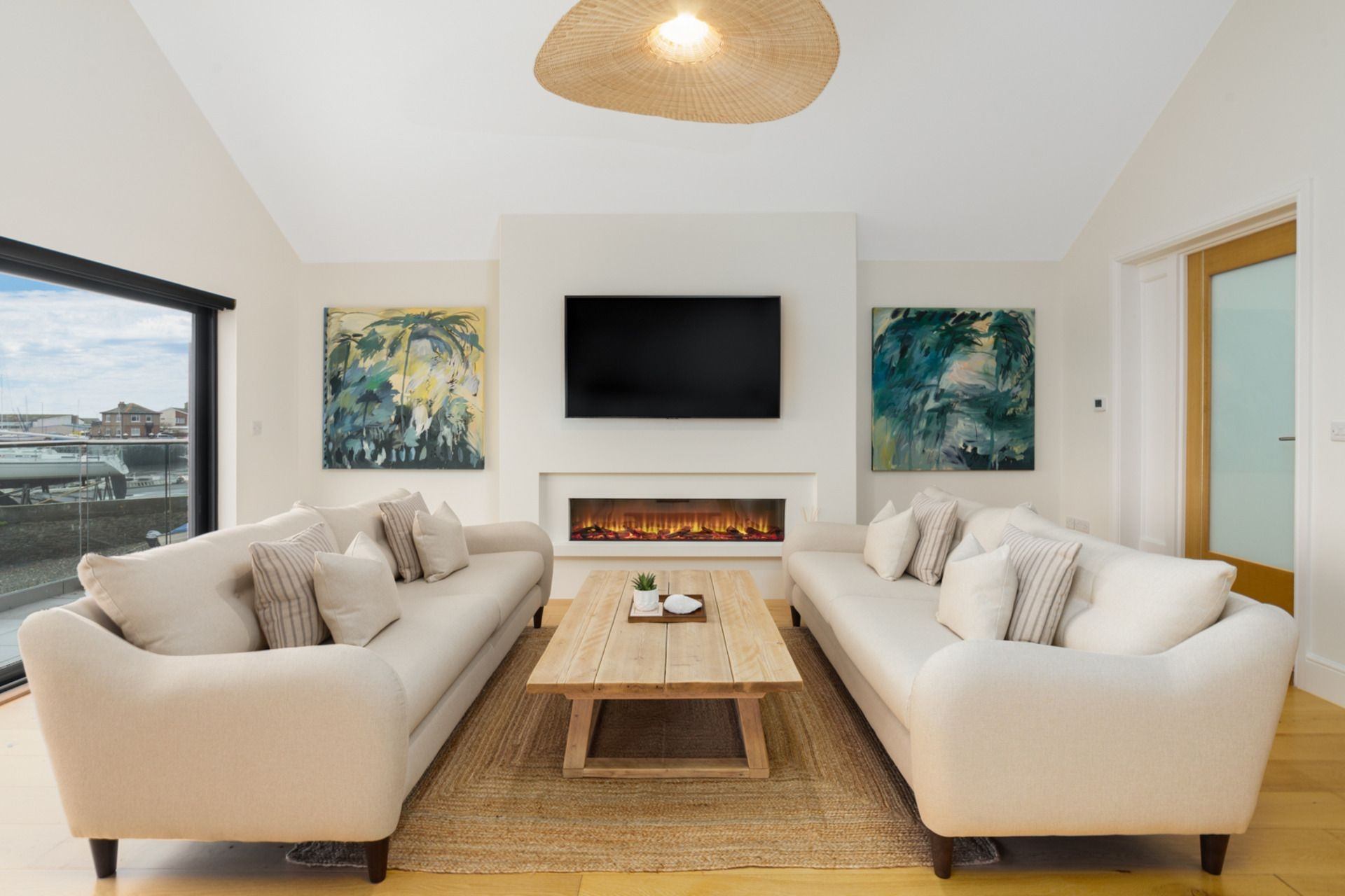 Lounge/Dining: Two large sofas providing direct 180 degree sea views, two armchairs, Smart electric fire, Smart TV, coffee table, Bluetooth speaker, dining table & eight chairs