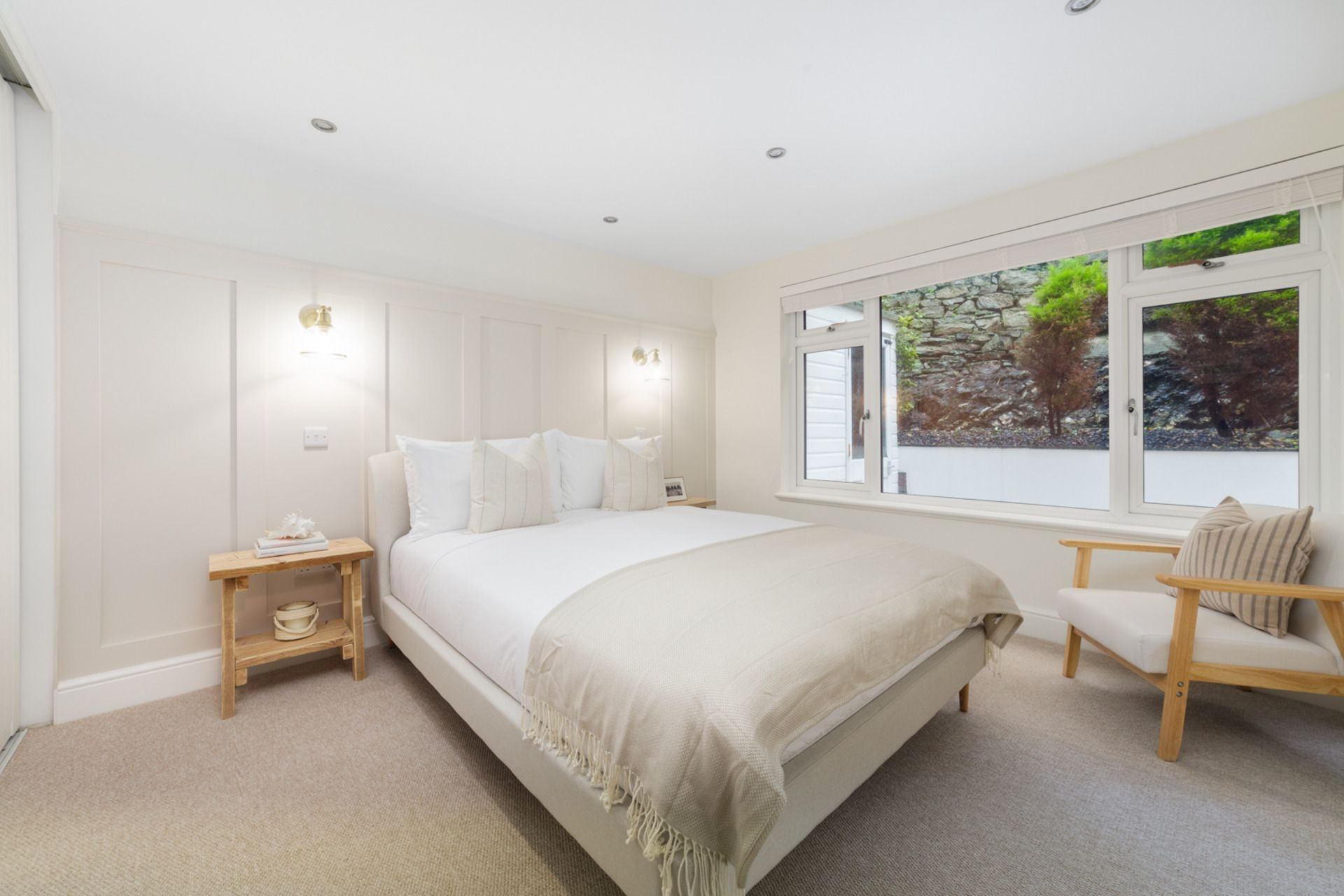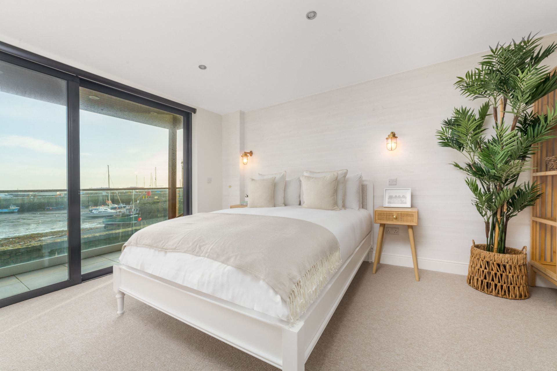 Bedroom 2: Ground Floor - Double bed, bedside tables, shelving, built-in wardrobe and harbour view.