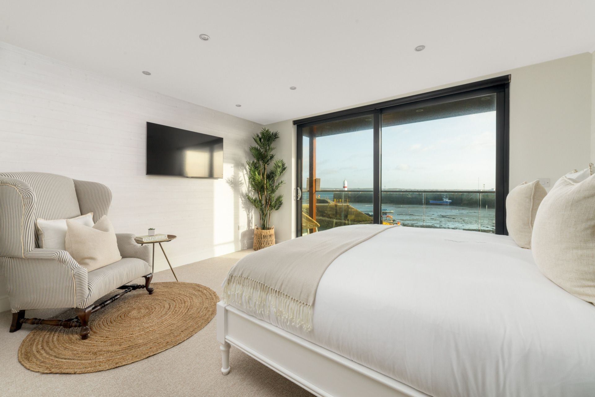 Bedroom 1: Ground Floor - King size bed, bedside tables, shelving and wardrobe. Direct coastal and harbour views