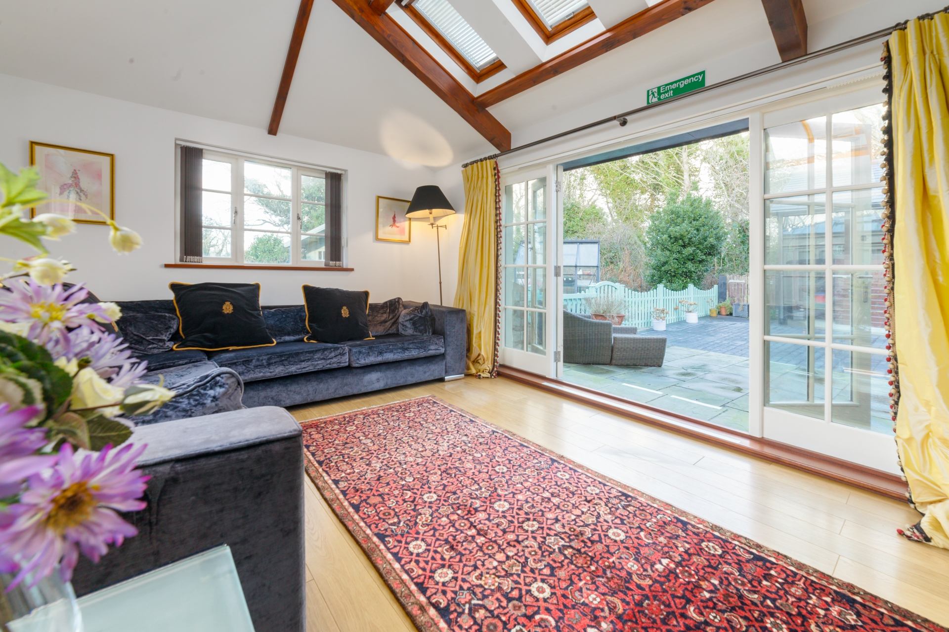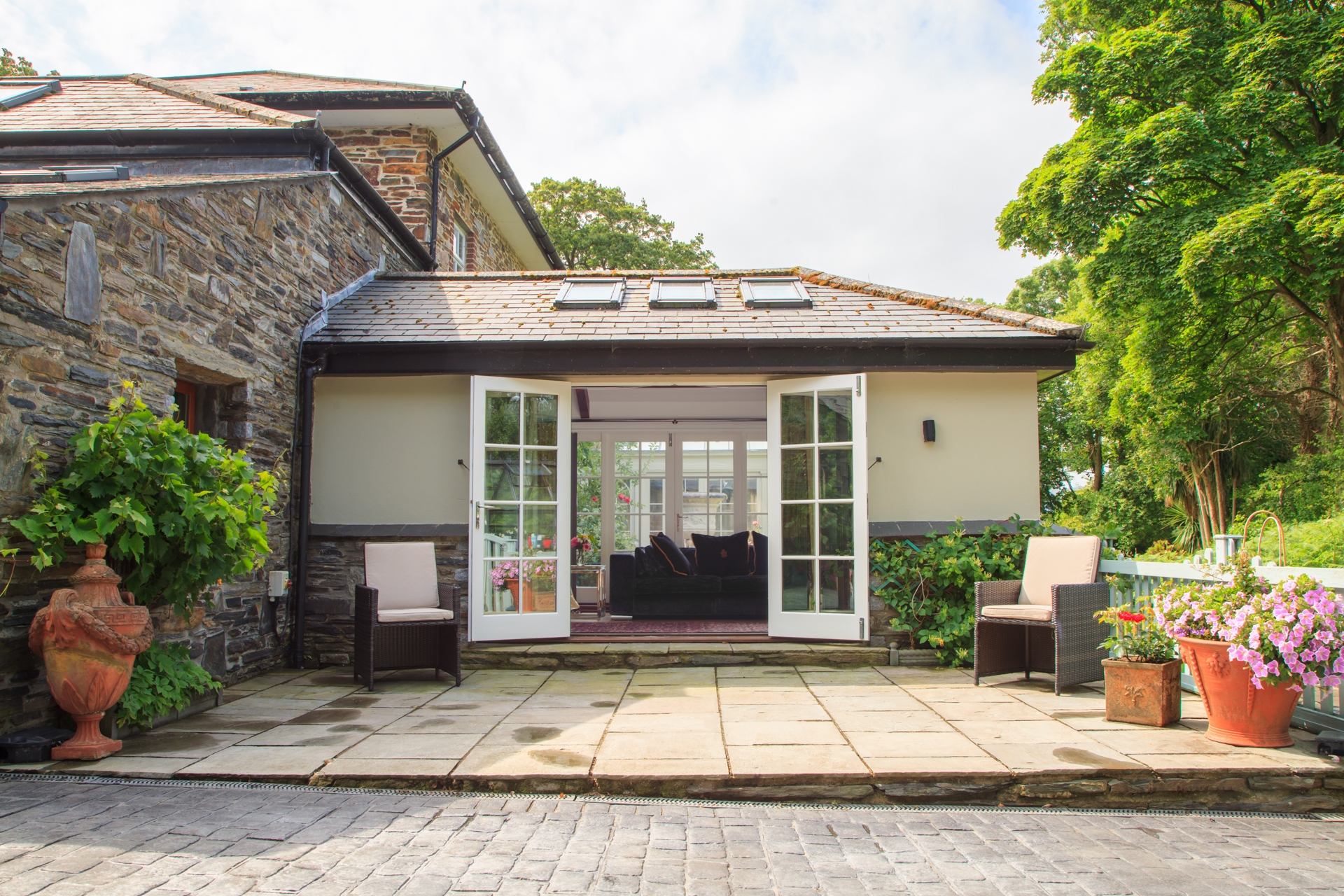 Living Room: Large L-shaped sofa, smart TV, bi-fold doors into courtyard.