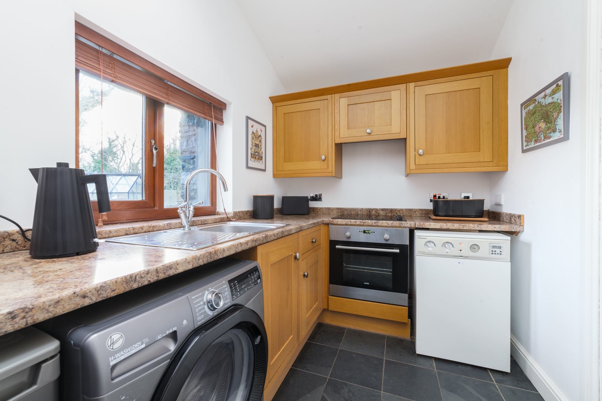 Kitchen: Fully equipped kitchen containing fridge, freezer, toaster, microwave, oven and washer/dryer.