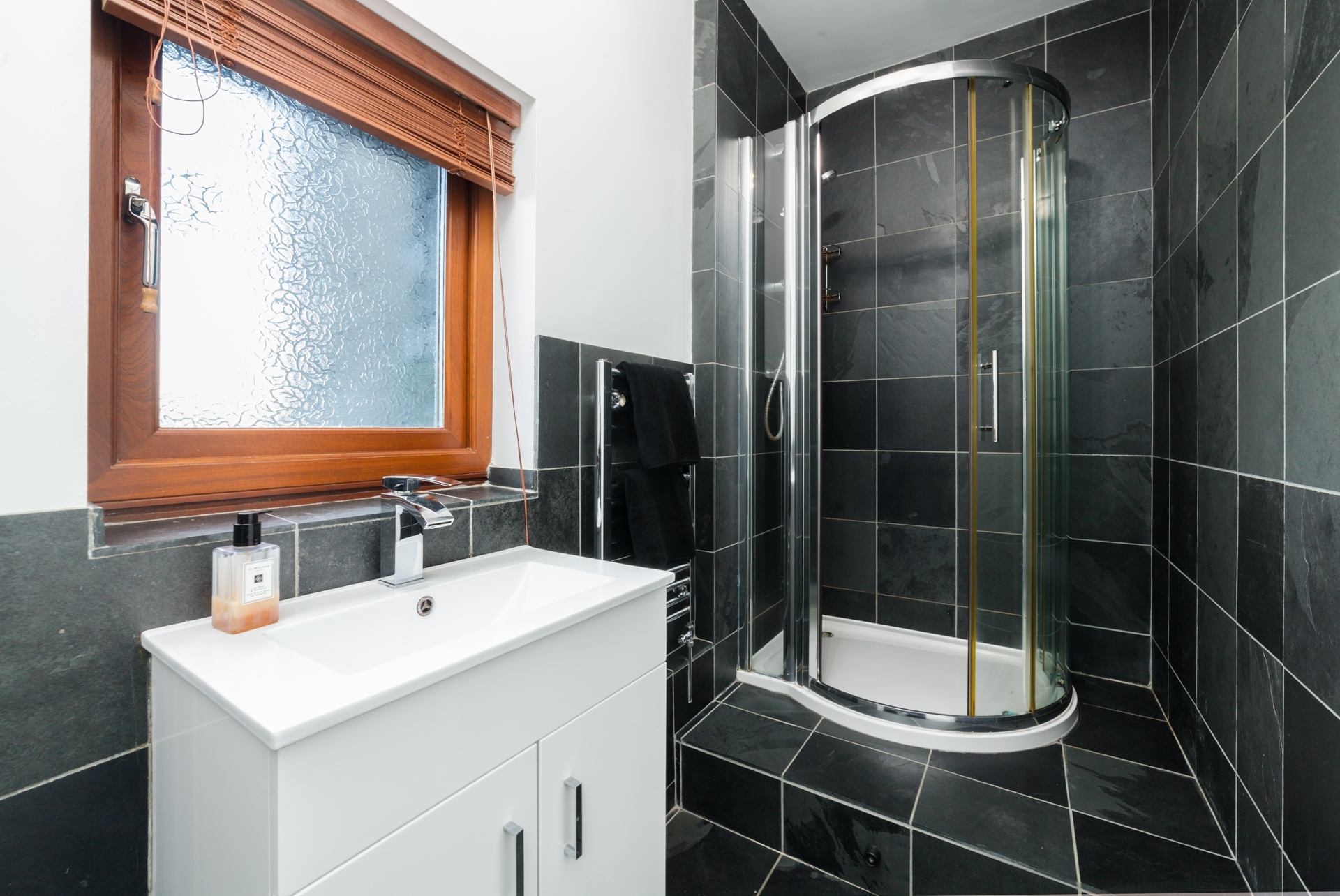 Bathroom: Walk-in shower, wash hand basin and WC. Please note there is a small step up to the shower.